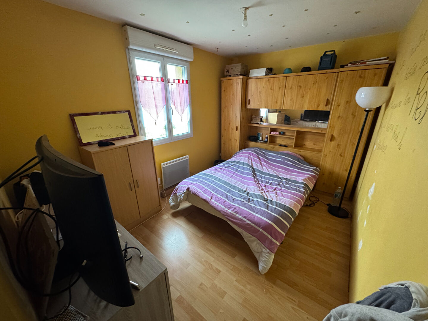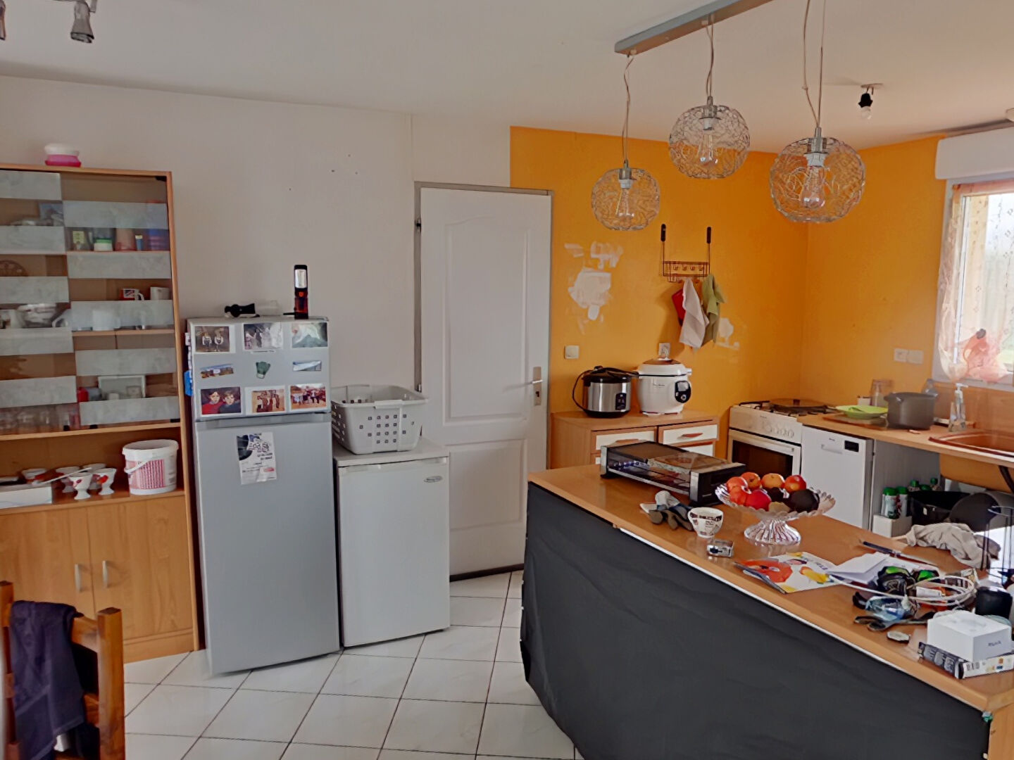 Un grand salon séjour avec cuisine ouverte, 3 chambres, une salle d'eau, toilettes.