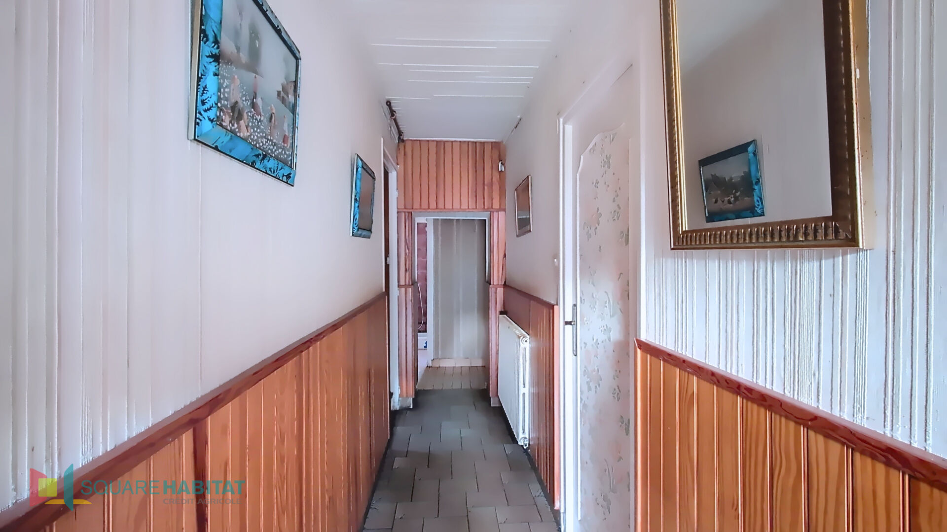 La maison se compose, au rez-de-chaussée, d'un salon séjour, d'une cuisine avec placards, d'un couloir desservant une chaufferie, une pièce pouvant être transformée en chambre, une salle d'eau et un WC. A l'étage, un palier dessert deux chambres et un bureau.