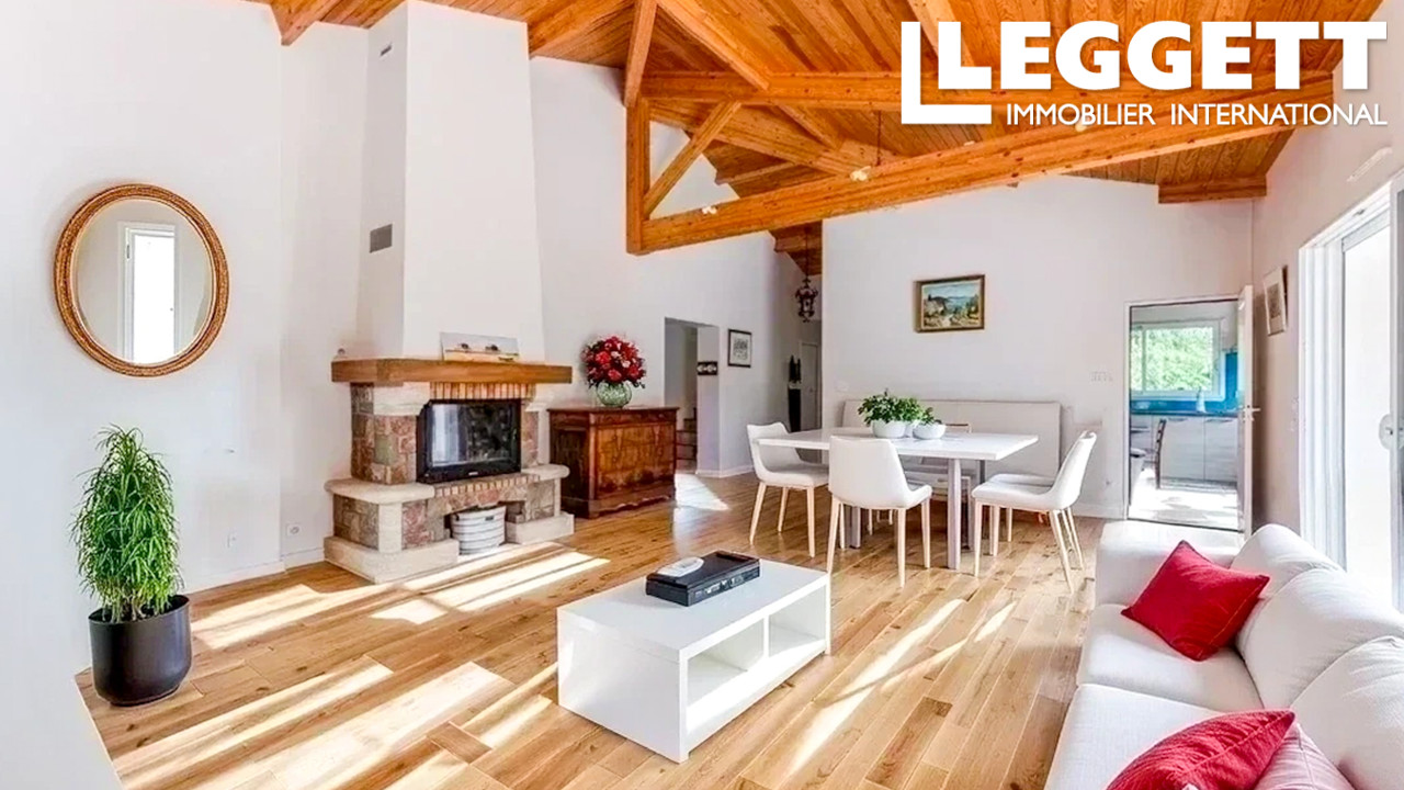 Cette maison familiale offre un séjour doté d'une belle charpente traditionnelle apparente et d'une cheminée insert une cuisine équipée avec cellier attenant, 6 chambres dont 3 en RDC, 3 salles d'eau/bains.