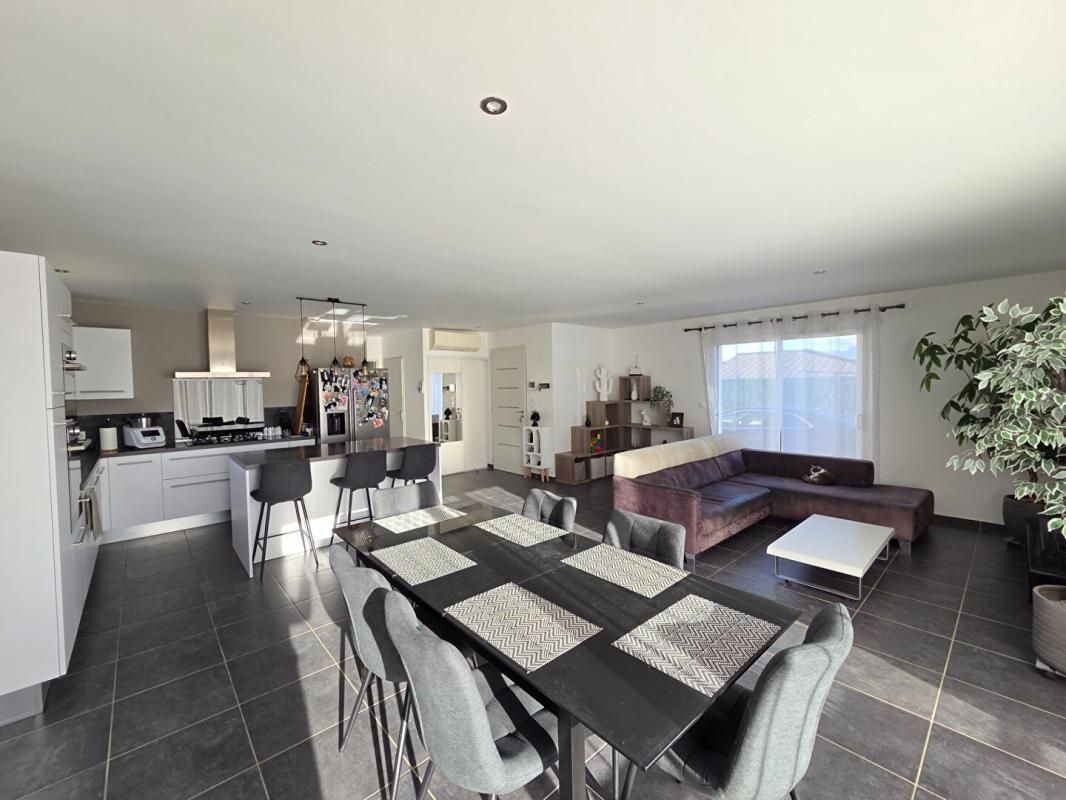 Vous découvrirez une vaste pièce de vie lumineuse de 50 m² avec cuisine aménagée et équipée, ouverte sur le séjour, ainsi qu'un cellier/buanderie attenant.