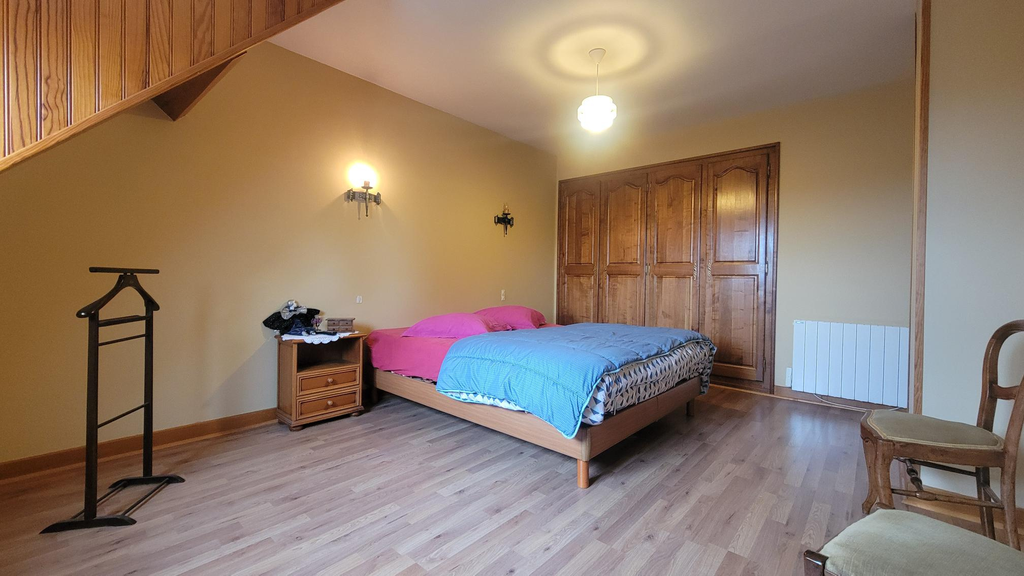 A l'étage : pièce palière, pièce, deux chambres, salle de bains avec douche, wc.