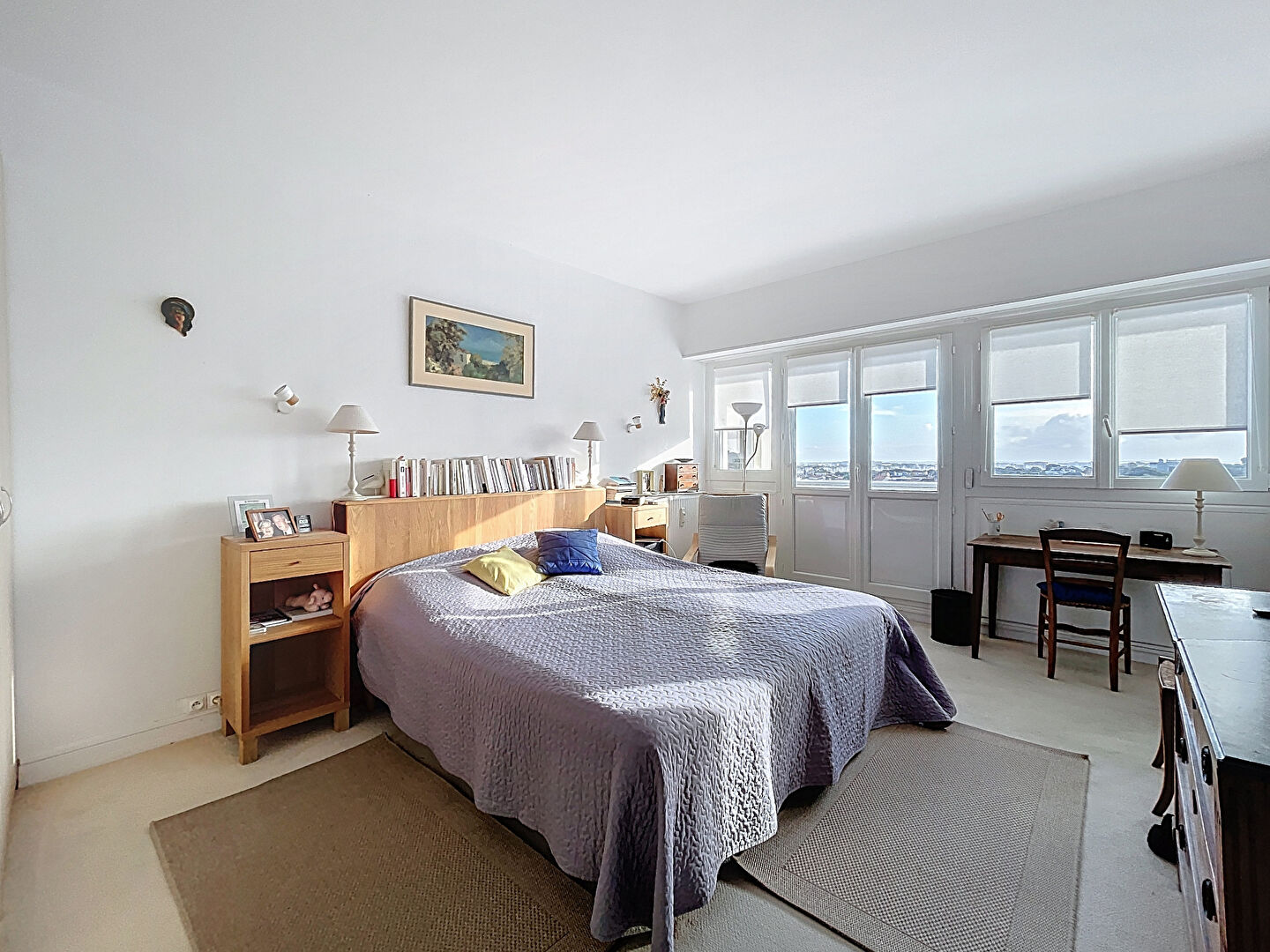 La Rochelle, vue panoramique sur la ville pour cet appartement de 182 m² très lumineux au dernier étage d'une copropriété dans le quartier de La Genette. Il est composé d'une entrée, d'une pièce à vivre de 56 m² exposée sud ouest, une cuisine récente aménagée et équipée, 4 ou 5 chambres selon la distribution choisie dont une avec une salle de bains. Un WC, buanderie, cellier et une salle de bains indépendante.