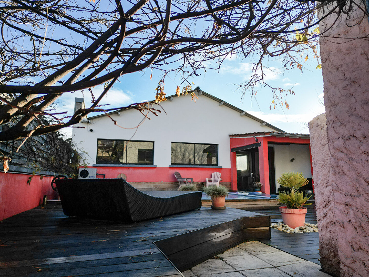 Différents espaces s'offrent à vous entre le jardin, la terrasse en bois avec sa piscine, le boulodrome et des parkings pour vos véhicules.