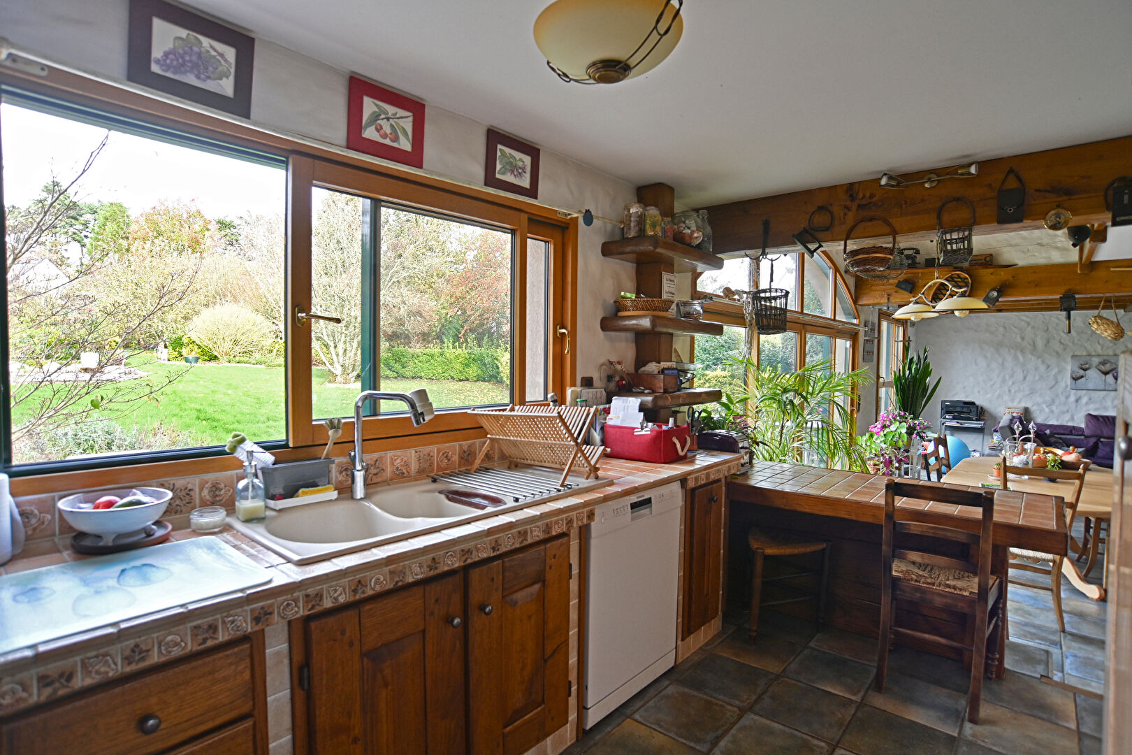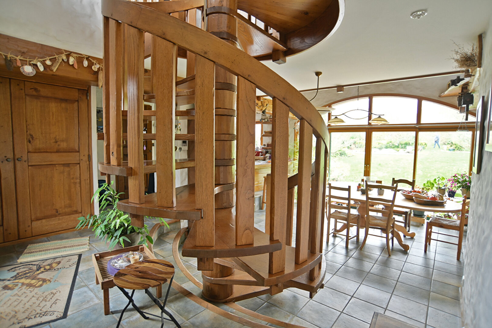 Le caractère chaleureux de la maison est porté par les poutres en châtaignier massif, un insert bois, du mobilier sur mesure, des murs en staff façonnés par un artisan savoyard et un carrelage rustique de caractère.