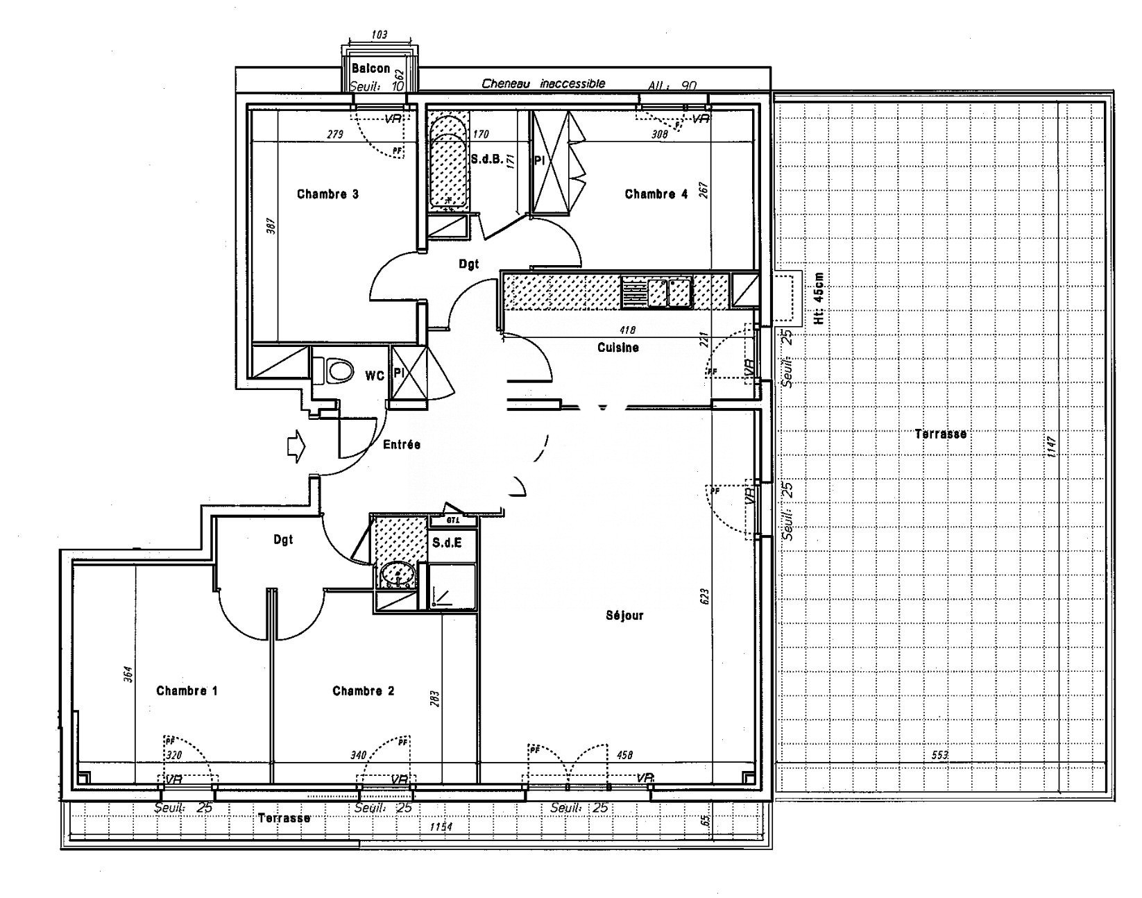 Il y a quatre chambres, dont trois avec balcon, une salle de bains, une salle d'eau, un wc séparé et des rangements.