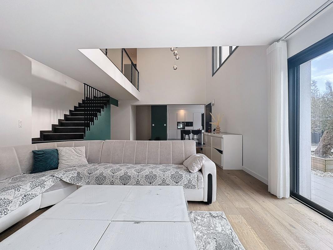LORIENT - LE MANIO - Dans une impasse paisible entourée de verdure, cette maison contemporaine construite en 2022 séduit par son style moderne et ses prestations soignées. Dès l'entrée, laissez-vous charmer par une pièce de vie spacieuse et lumineuse, grâce à de grandes baies vitrées à galandage ouvrant sur une terrasse exposée sud-ouest. Avec une hauteur sous plafond de plus de 5 mètres, l'espace offre une sensation de volume unique. La cuisine ouverte est entièrement aménagée et équipée. Ce niveau propose également une chambre avec salle d'eau privative, un WC, une arrière-cuisine et une buanderie avec accès direct à l'extérieur. À l'étage, vous trouverez trois belles chambres dont une avec dressing et une salle de bains avec WC. À l'extérieur, un stationnement privé complète le tout. Cette maison combine modernité et économies d'énergie, avec des coûts énergétiques particulièrement faibles grâce à sa conception récente.