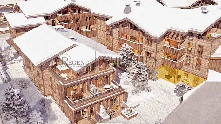 Résidence de grand standing comprenant 39 appartements, bardage en vieux en bois sur les façades, habillage en pierre de taille du pays, chêneaux en cuivre, finitions reflétant l'esprit chalet, signature des constructeurs locaux Biotope et Aspen Immobilier.