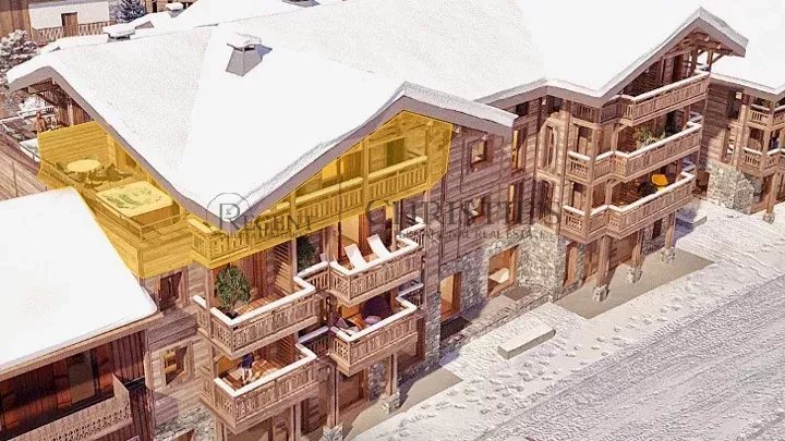 Résidence de grand standing comprenant 39 appartements, bardage en vieux en bois sur les façades, habillage en pierre de taille du pays, chêneaux en cuivre, finitions reflétant l'esprit chalet, signature des constructeurs locaux Biotope et Aspen Immobilier.