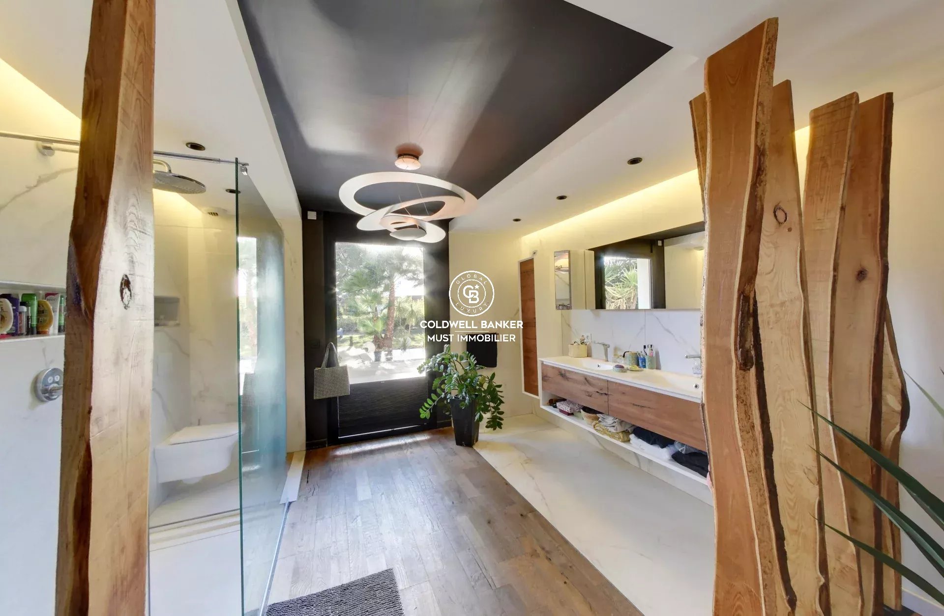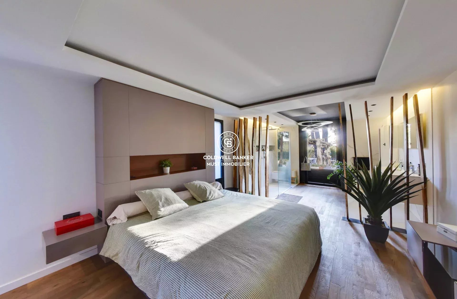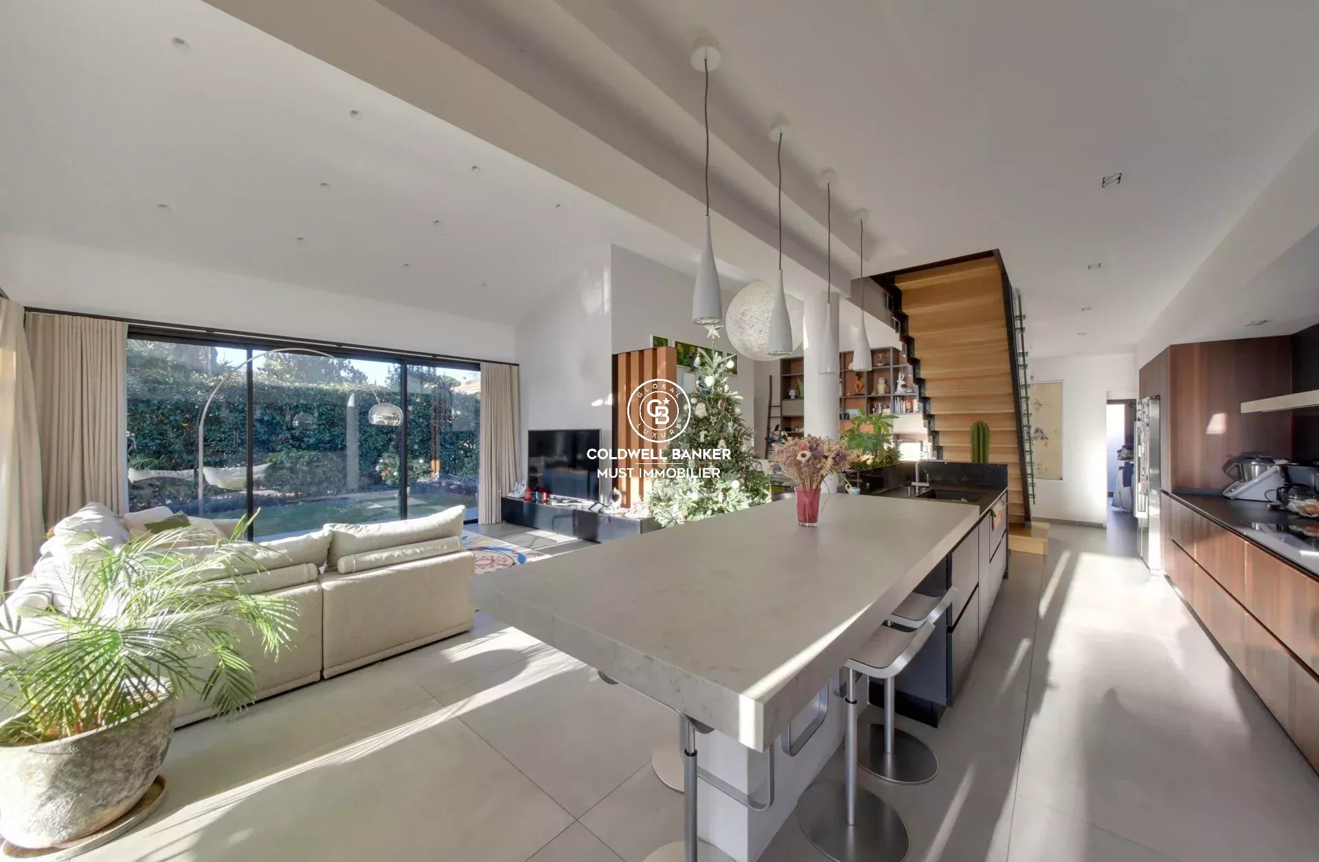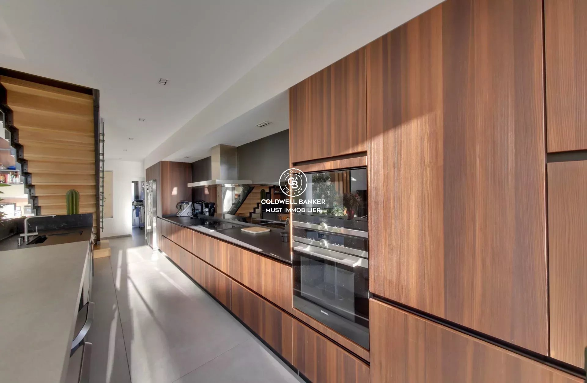 Les extérieurs ont été pensés comme une véritable extension de l’espace de vie : piscine élégamment intégrée, cuisine d’été conviviale, larges terrasses et jardin arboré. Une buanderie et un garage viennent compléter les prestations de ce bien.