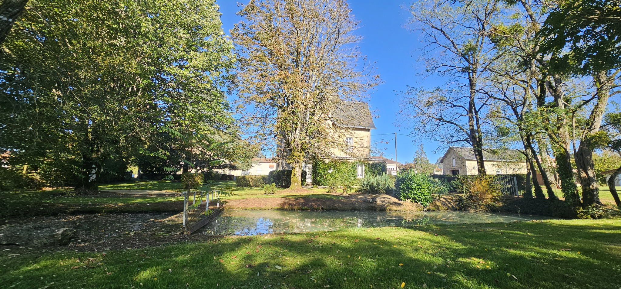 Parc arboré avec plan d'eau, espace barbecue et un puits fonctionnel.