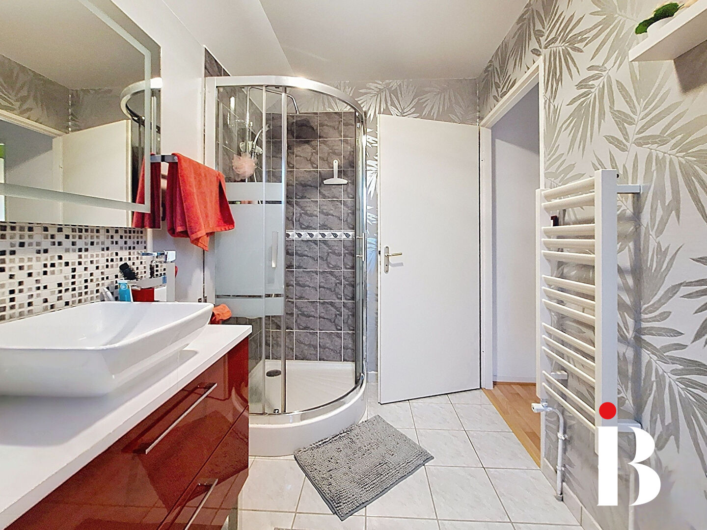 A l'étage, le palier dessert 3 chambres avec parquet flottant ainsi qu'une salle d'eau lumineuse (fenêtre oscillo-battante) et équipée d'une douche, d'une vasque et d'un WC.
