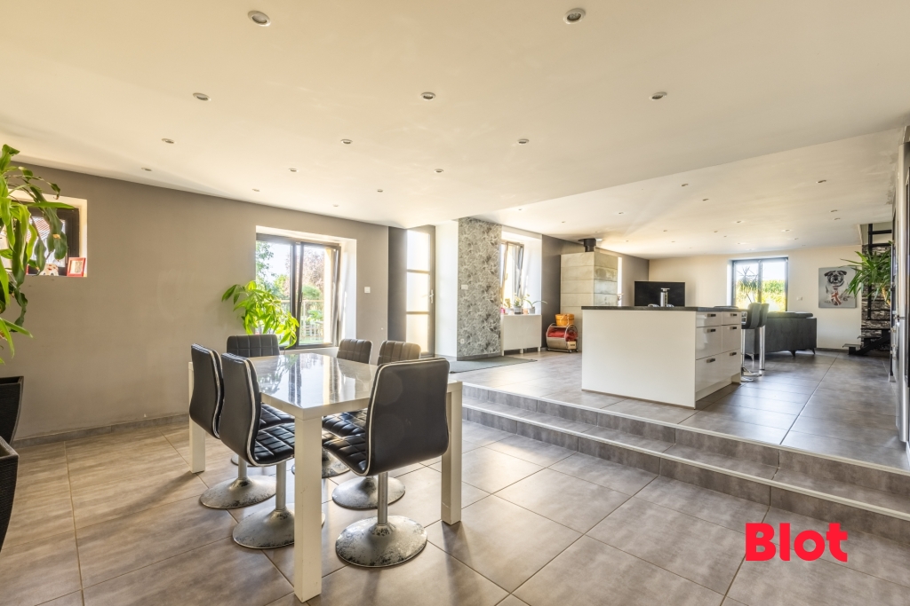 Dès l'entrée, vous découvrirez un vaste espace de vie de plus de 65 m², baigné de lumière, comprenant une cuisine moderne et aménagée, un séjour convivial et un salon chaleureux avec sa cheminée insert.