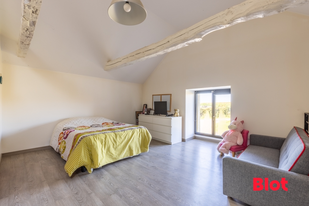 À l'étage, une mezzanine de plus de 68 m2 ( création de 2-3 chambres supplémentaires possible ), une salle d'eau avec WC et une grande chambre de plus de 30 m2.