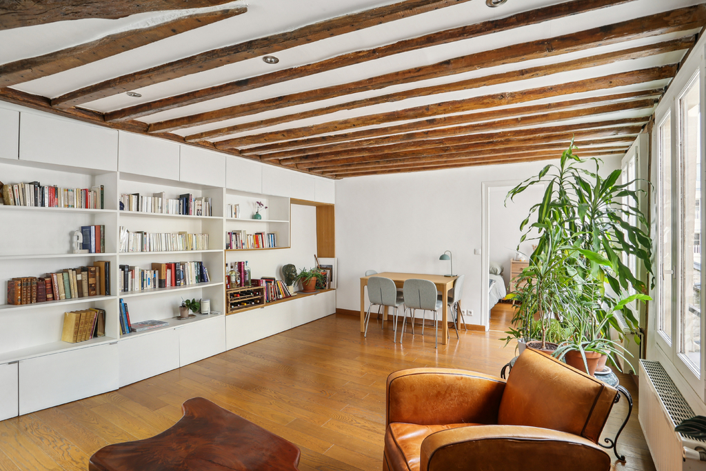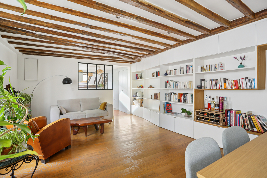 La pièce de vie, orientée Est et tournée vers la petite cour, constitue le véritable centre de l'appartement. Poutres, parquet et rangements intégrés sur mesure contribuent à une atmosphère chaleureuse et authentique, tout en permettant une optimisation fluide de l'espace.