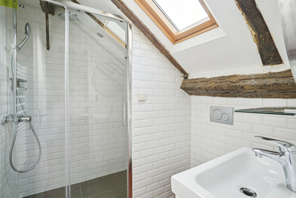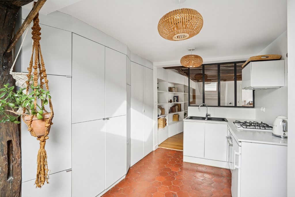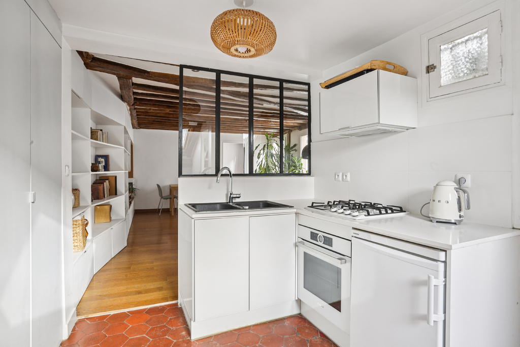L'entrée s'effectue par la cuisine, partiellement mansardée et éclairée par un velux exposé sud. Compacte mais fonctionnelle, elle est mise en valeur par une verrière atelier qui ouvre le regard vers la pièce de vie. La salle d'eau avec WC, également sous pente et dotée d'un velux côté rue, complète cet espace d'accueil.