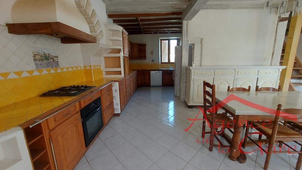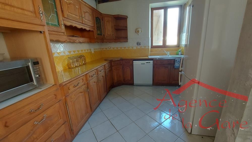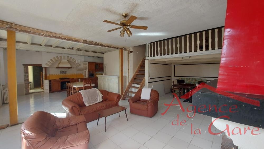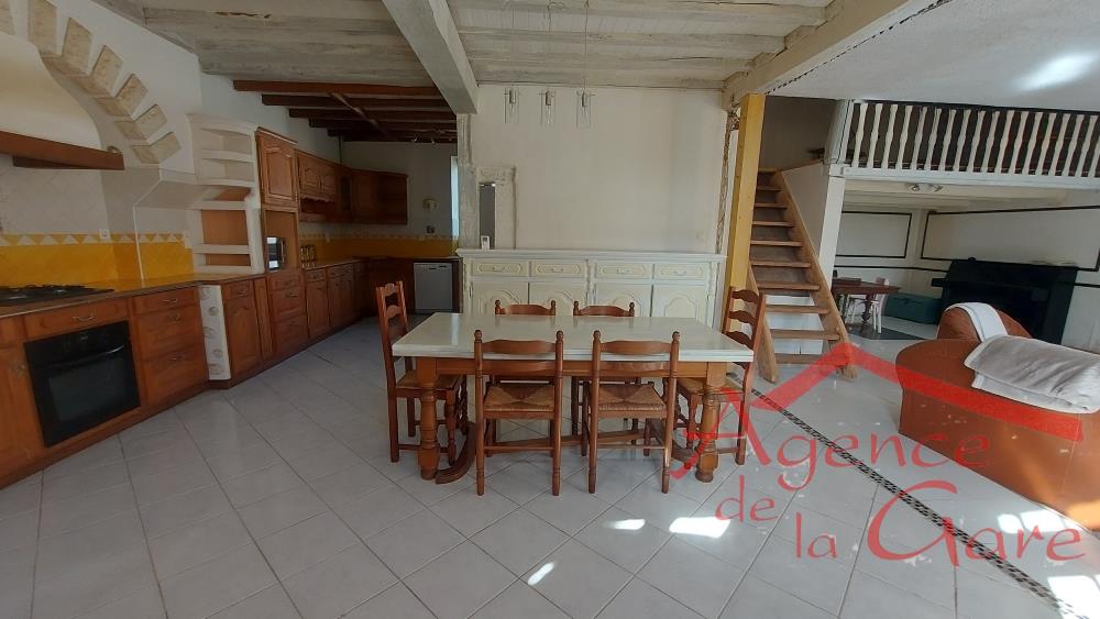 Une cuisine aménagée ouverte sur un vaste séjour-salon de 70 m² avec cheminée insert et mezzanine,