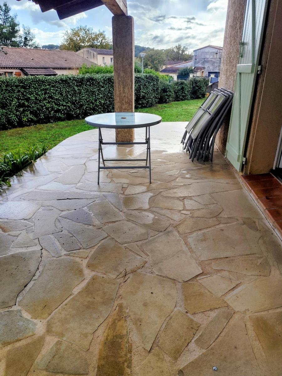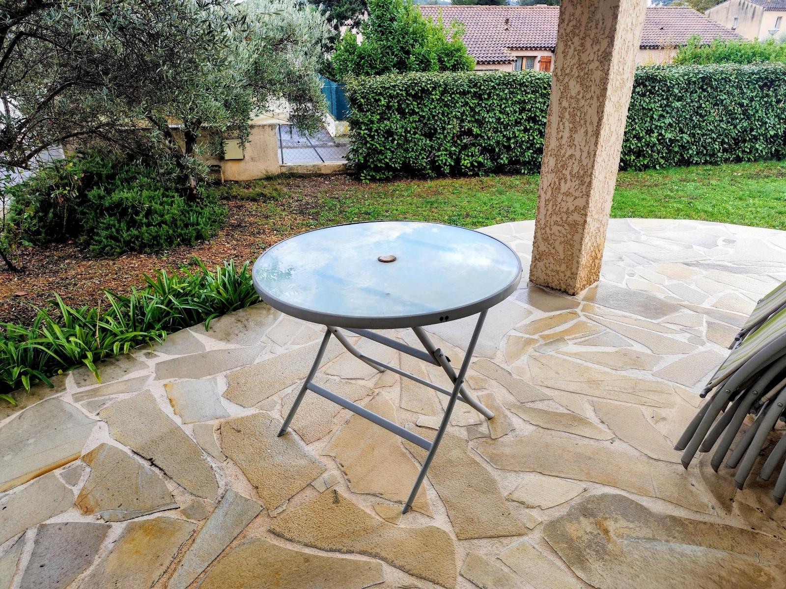 Une loggia couverte à l'est et une terrasse plein sud, vous profiterez d'une terrasse couverte, idéale pour les repas en plein air, ainsi que d'un terrain de 675 m² offrant de belles possibilités d'aménagement ( piscinable ),Terrain arboré (oliviers, cyprès...)