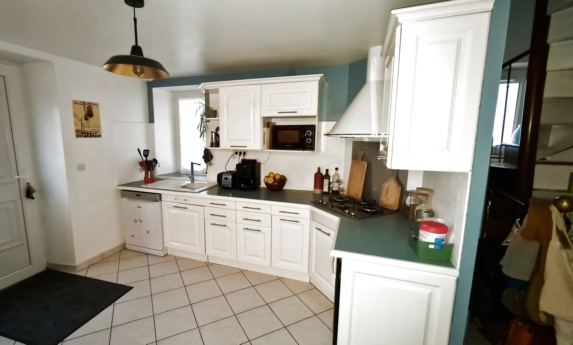 Au rez-de-chaussée une pièce de vie avec cuisine ouverte, une salle à manger/salon avec un poêle à bois, wc indépendant. Au rez-de-jardin : 2 chambres, un wc, une salle d'eau.