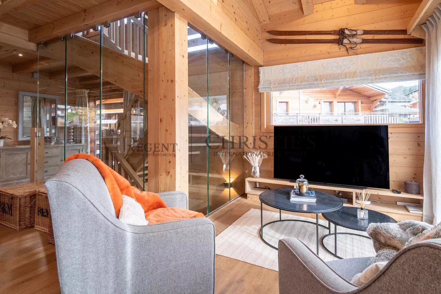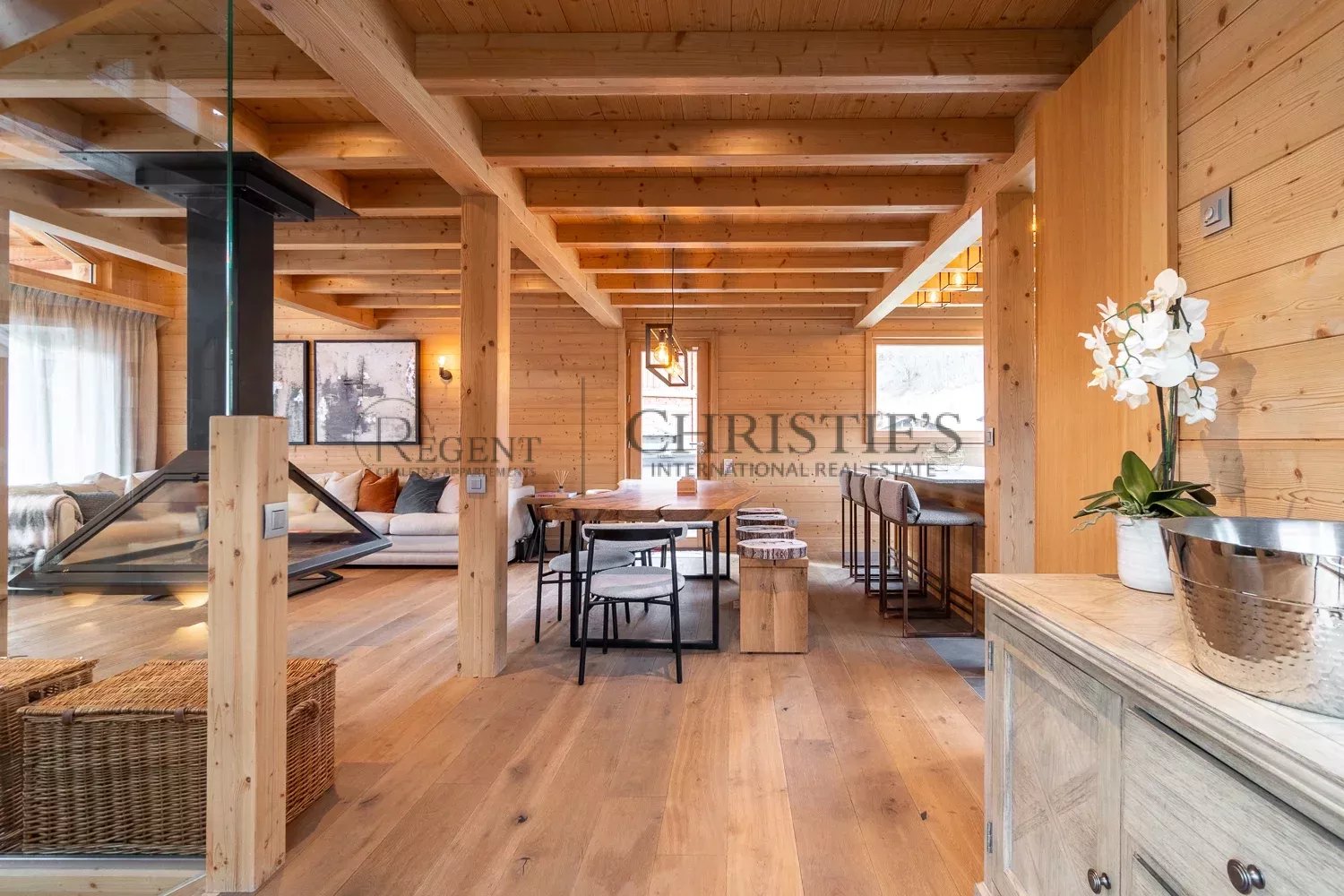 Au premier étage se trouve un vaste et lumineux espace de vie ouvert, baigné de lumière grâce à ses baies vitrées orientées au sud. Le salon comprend un grand canapé d'angle avec cheminée centrale, un coin TV confortable, un espace salle à manger, un bar et une belle cuisine entièrement équipée. Le tout s’ouvrant sur une terrasse exposée sud, et sur le côté du chalet vous pourrez profiter du jacuzzi après une bonne journée de ski.