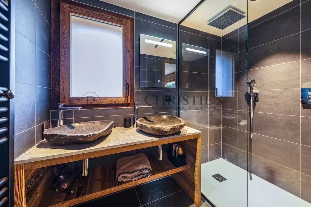 Résidence de grand standing comprenant 39 appartements, bardage en vieux en bois sur les façades, habillage en pierre de taille du pays, chêneaux en cuivre, finitions reflétant l'esprit chalet, signature des constructeurs locaux Biotope et Aspen Immobilier.