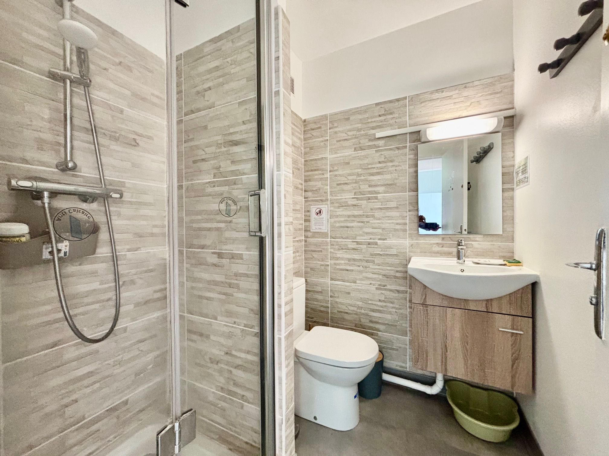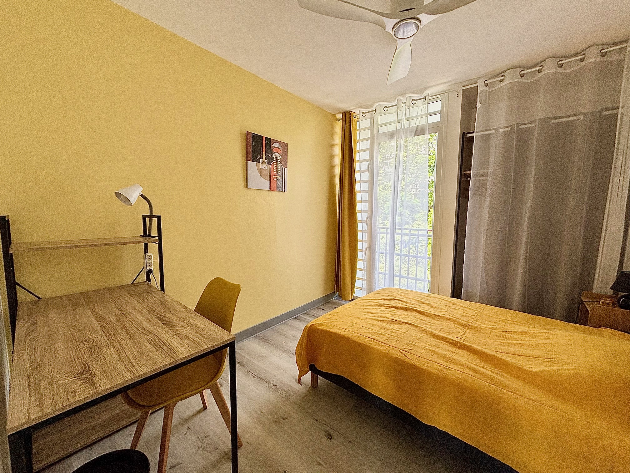 L'entrée s'ouvre sur un séjour lumineu et conviviale. La cuisine, entièrement équipée, offre des espaces de rangement fonctionnels et un accès direct à un cellier très pratique pour le quotidien. Le séjour donne accès également à une chambre et un balcon, idéal pour profiter de l'extérieur.