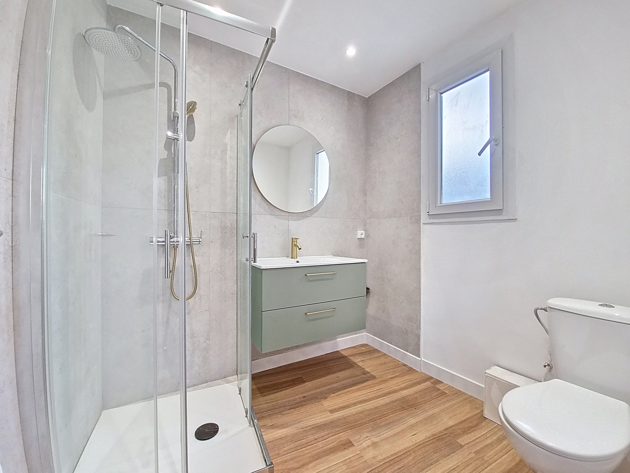 L'appartement dispose également d'une salle d'eau rénovée avec wc et d'une entrée équipée de rangements.