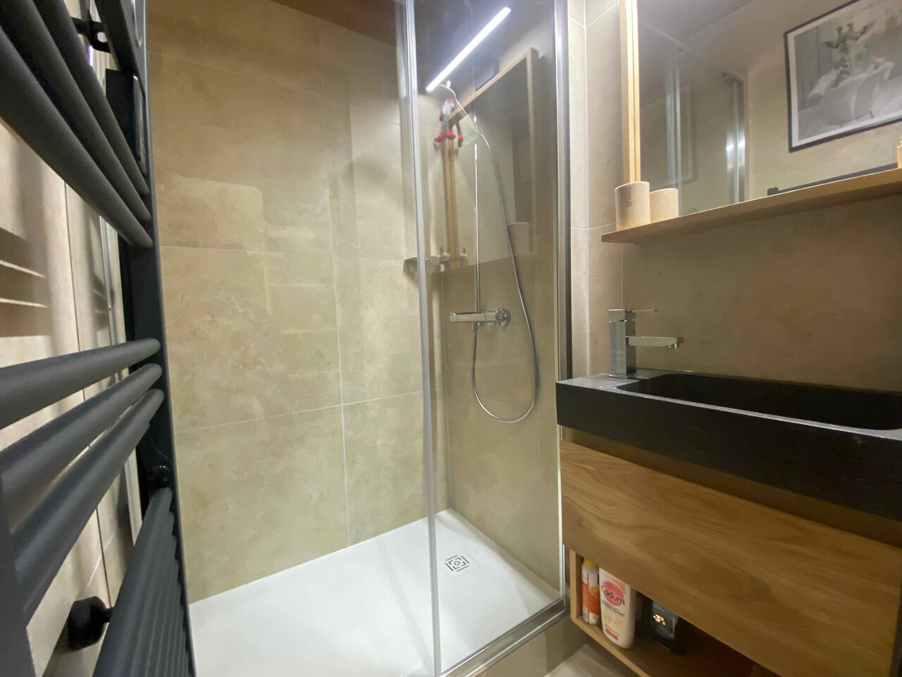 Niveau 2 : entrée-coin montagne, salle de douche, wc, salle de vie avec cuisine équipée, salon, balcon Ouest