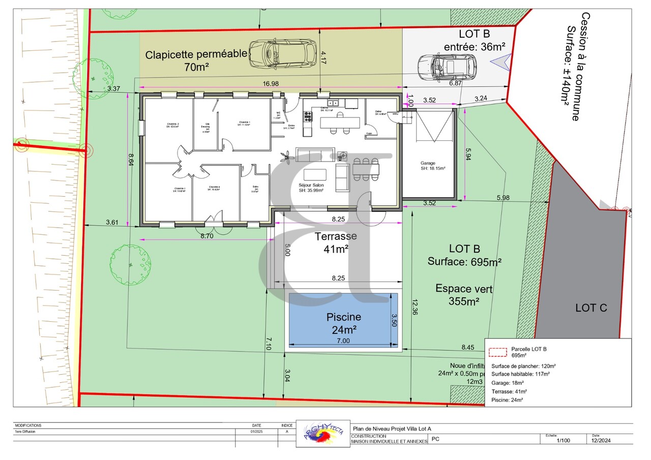 • Construction : un permis de construire pour une maison de plain-pied de 117 m² avec garage, terrasse et piscine a été obtenu, celui-ci est modifiable selon vos préférences,
