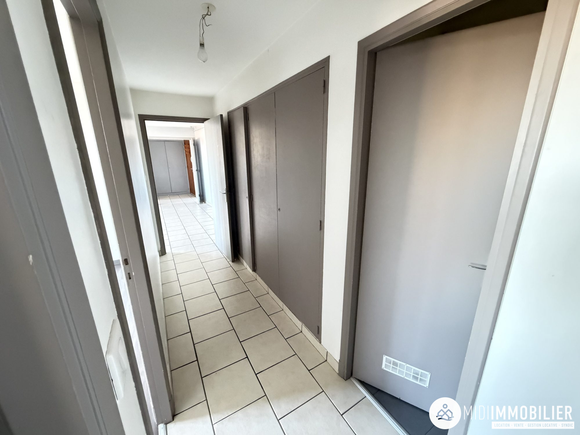 Le couloir avec placard distribue une salle d'eau moderne, des toilettes indépendantes et deux grandes chambres.
