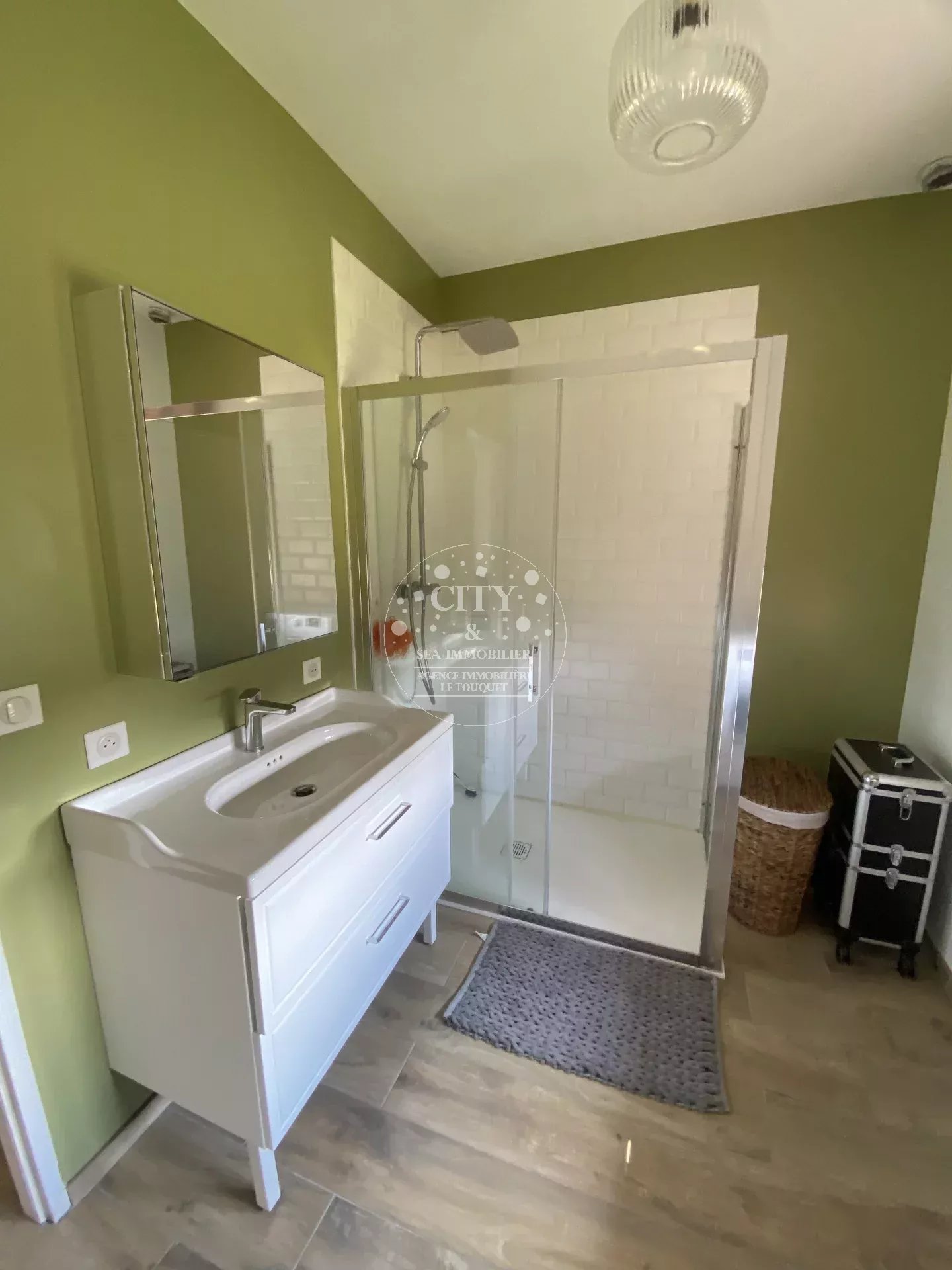 - Une salle-de-bain carrelée et faïencée comprenant un meuble vasque, une douche et sèche serviette
