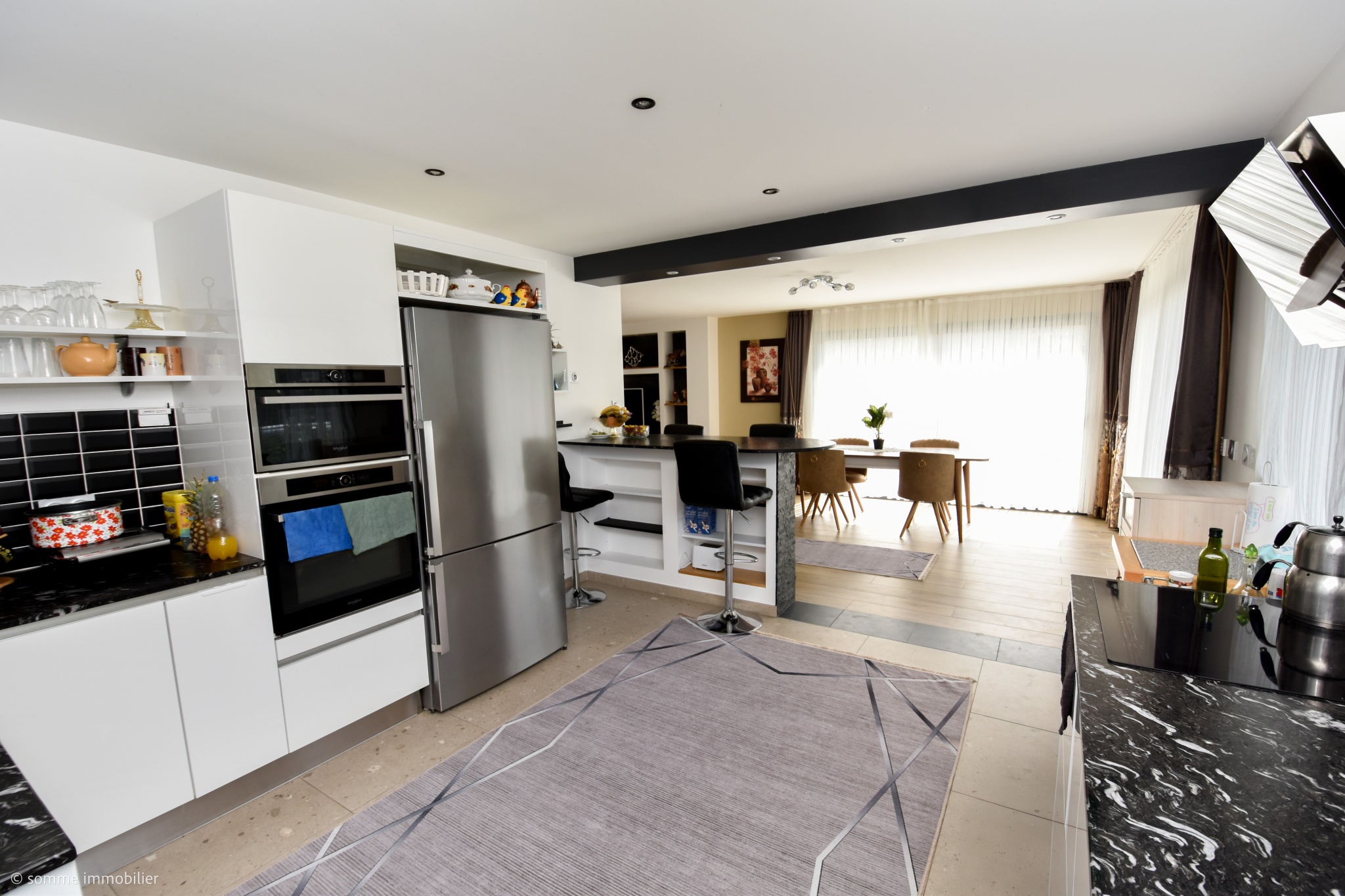 Au rez-de-chaussée : d'un hall d'entrée, d'un vaste séjour/salon ouvert sur une cuisine aménagée et équipée, d'une arrière-cuisine, d'une chambre de plain-pied, d'une salle d'eau et de WC séparés.À l'étage : un palier desservant quatre chambres, chacune équipée d'un dressing intégré, ainsi qu'une salle de bains et de WC séparés.