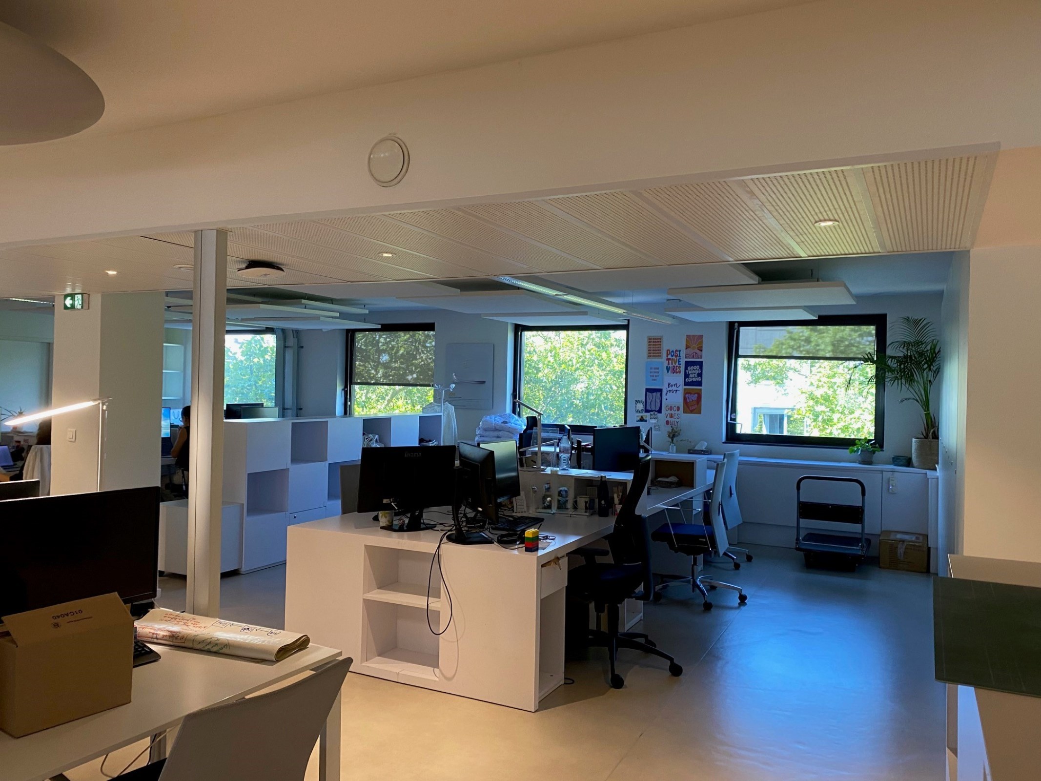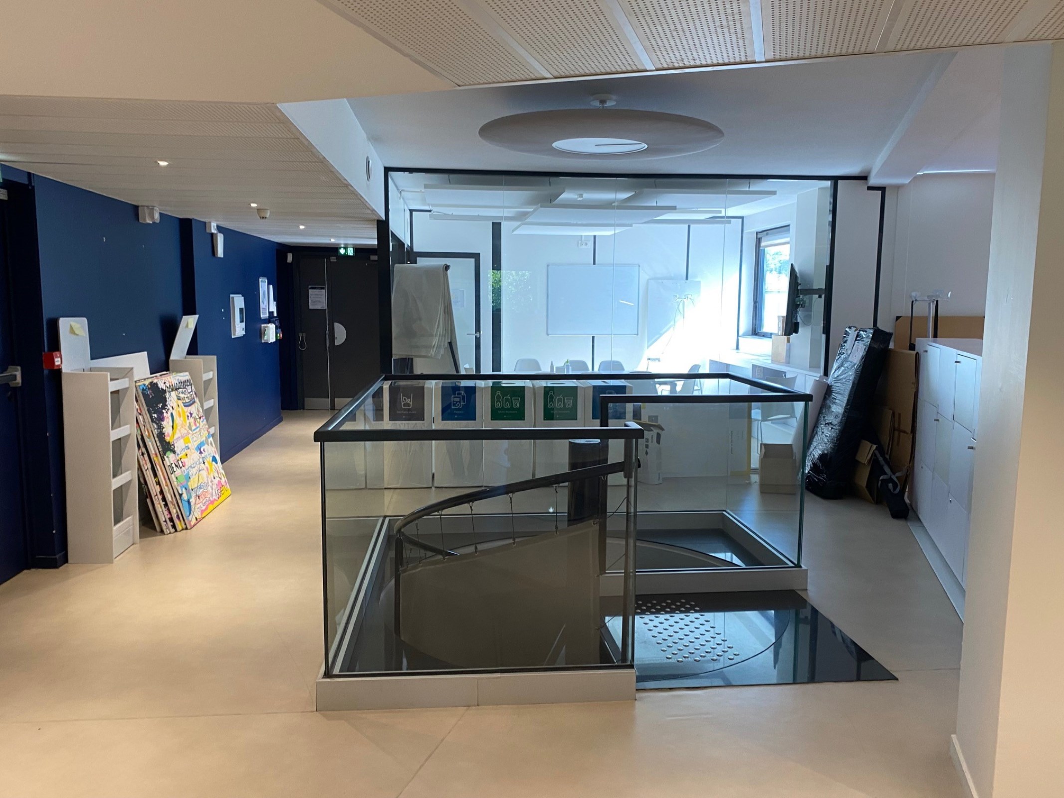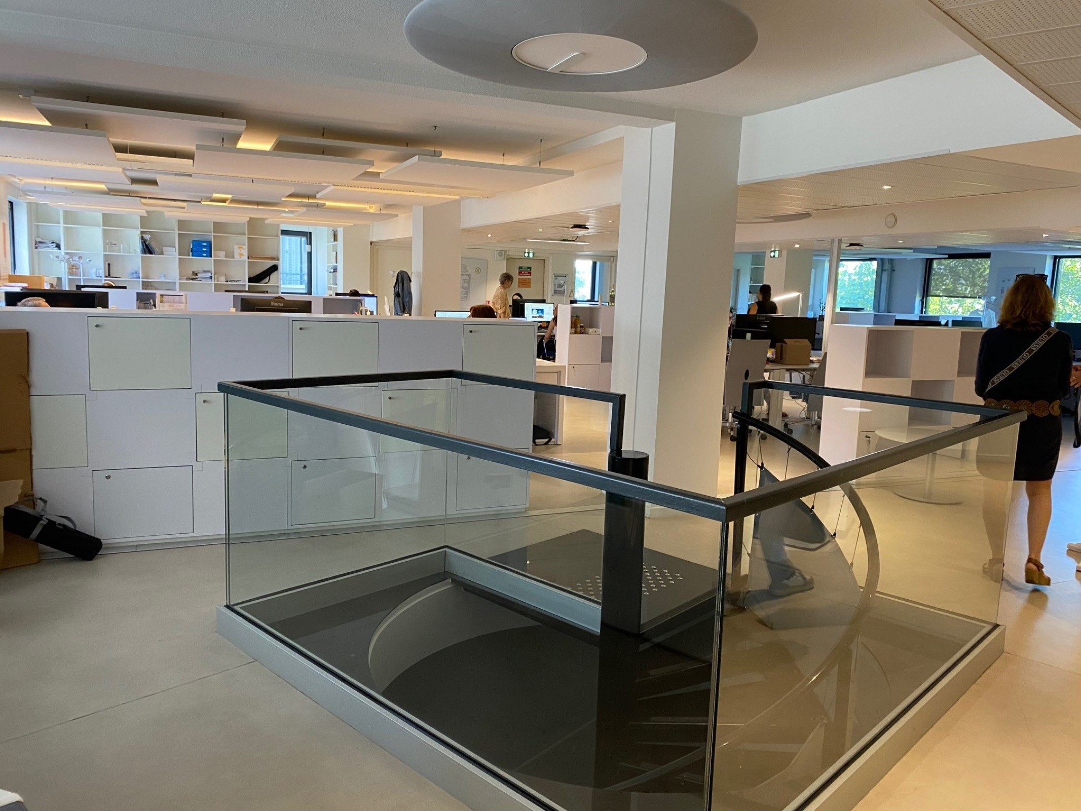Dans un immeuble de seconde main avec un patio central, un plateau de bureaux partiellement cloisonné avec un escalier intérieur en bon état.