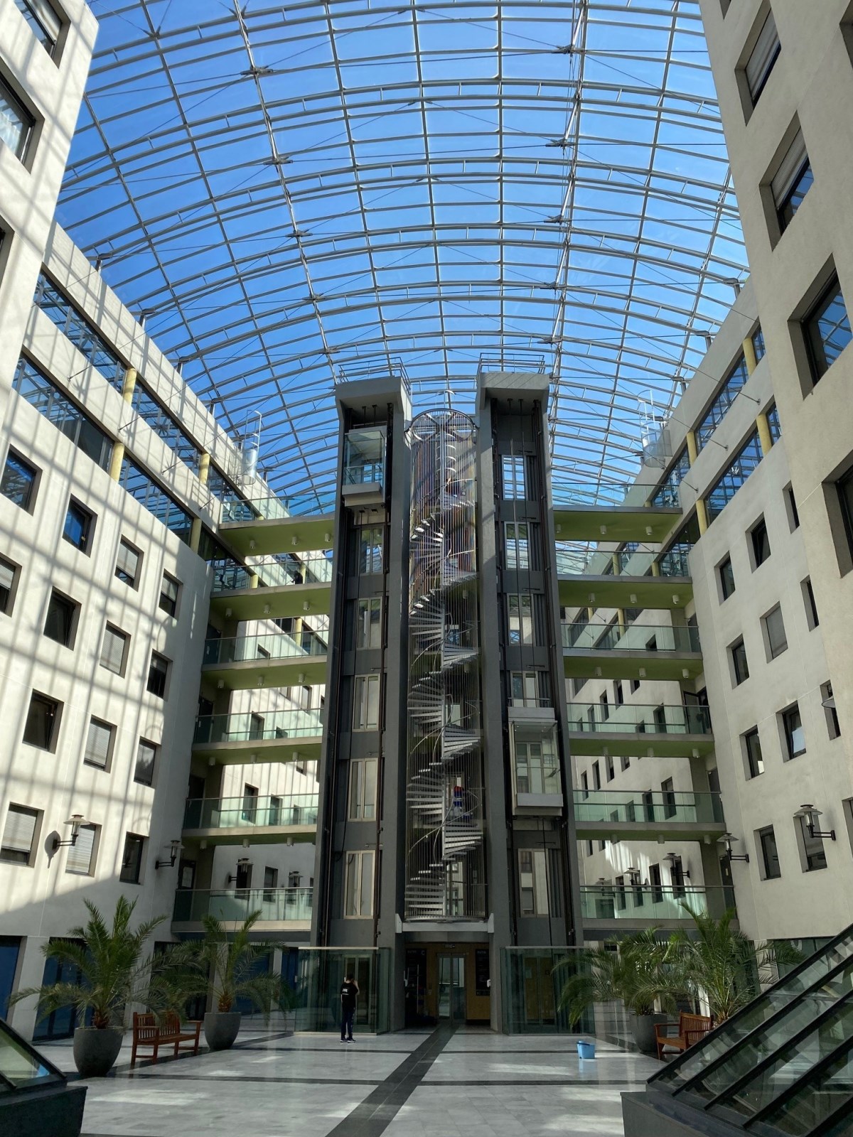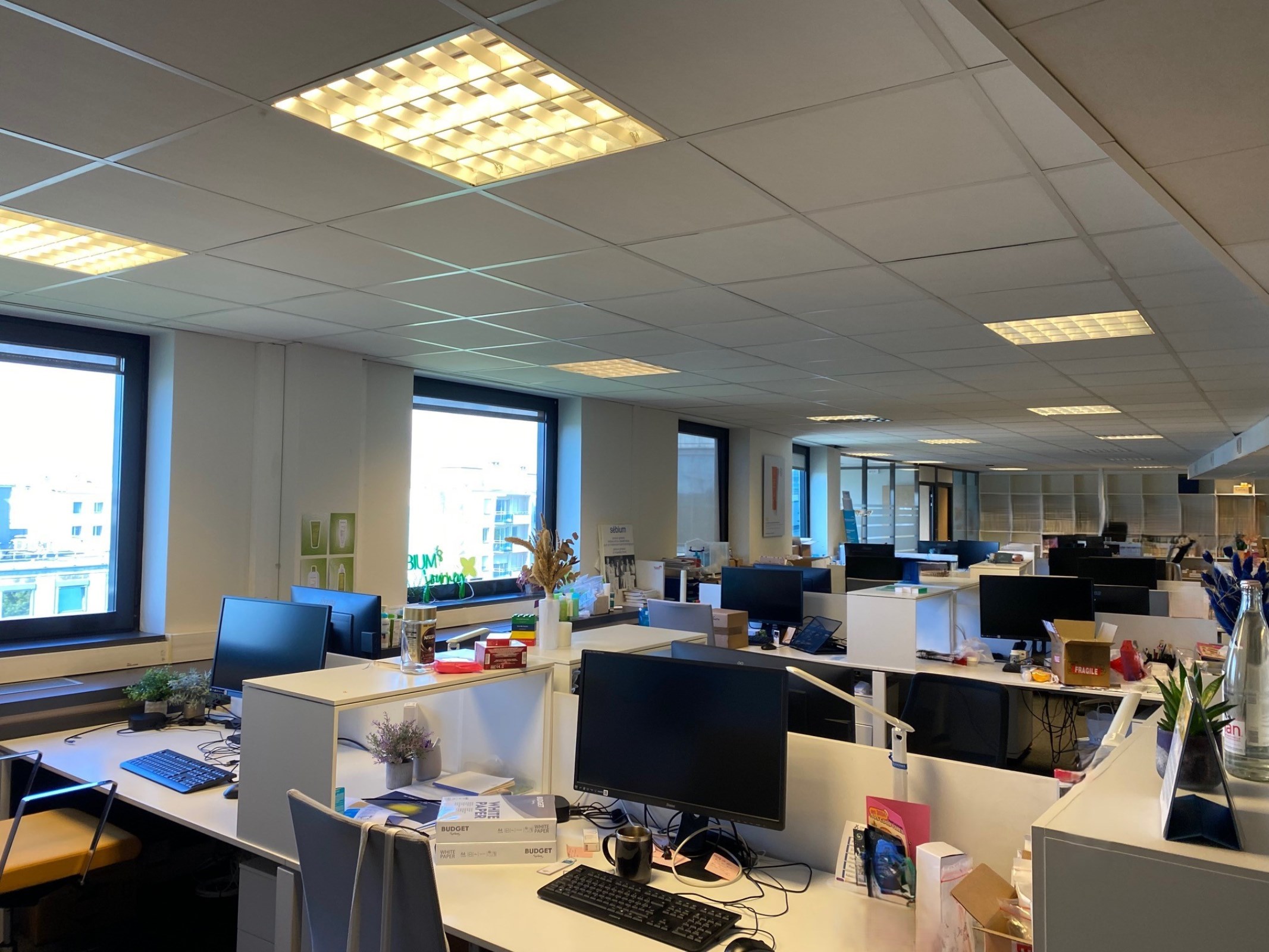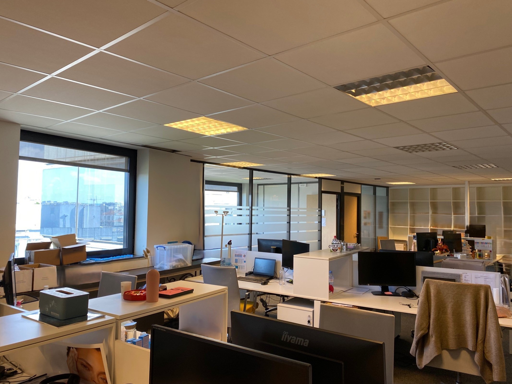 Dans un immeuble de seconde main avec un patio central, un plateau de bureaux partiellement cloisonné avec un escalier intérieur en bon état.