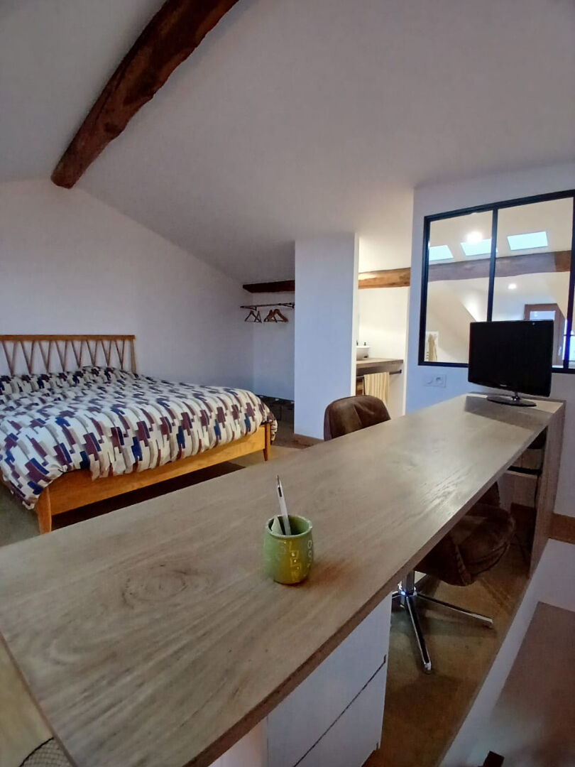 Enfin un dernier niveau suite parentale, grande chambre , espace bureau, bibliothèque et salle de bain privative avec baignoire.