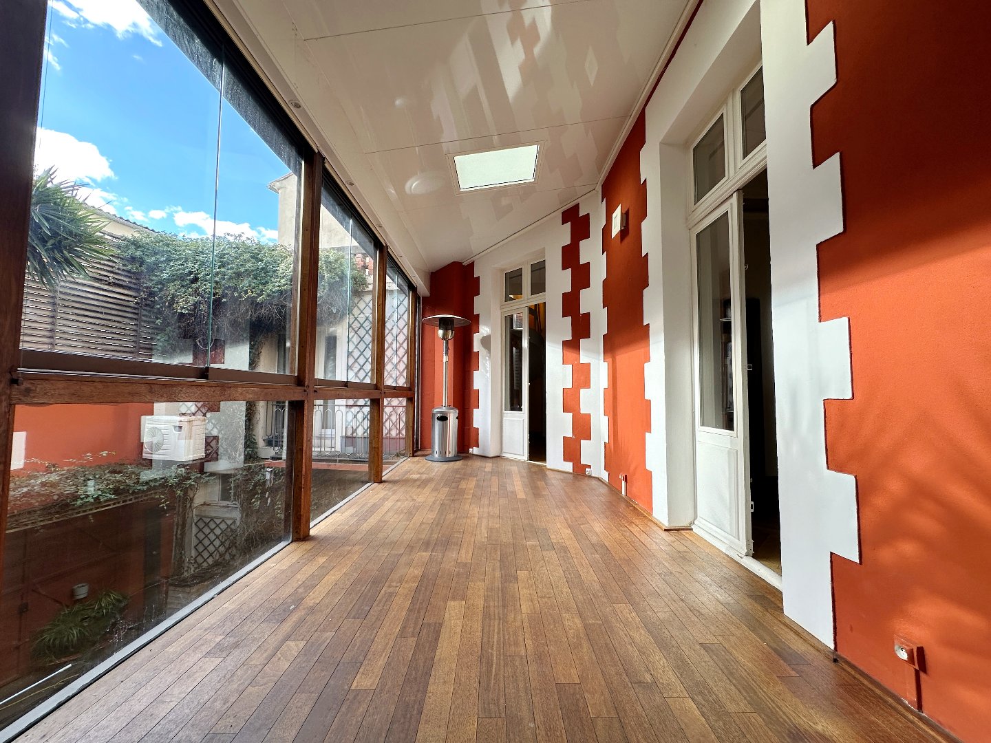 Le bâtiment se développe ensuite autour d'une seconde cour intérieure, totalement à l'abri des regards, transformée aujourd'hui en espace de vie contemporain avec piscine, pontons en bois, verrières et végétation luxuriante ? une oasis rare en plein centre-ville.