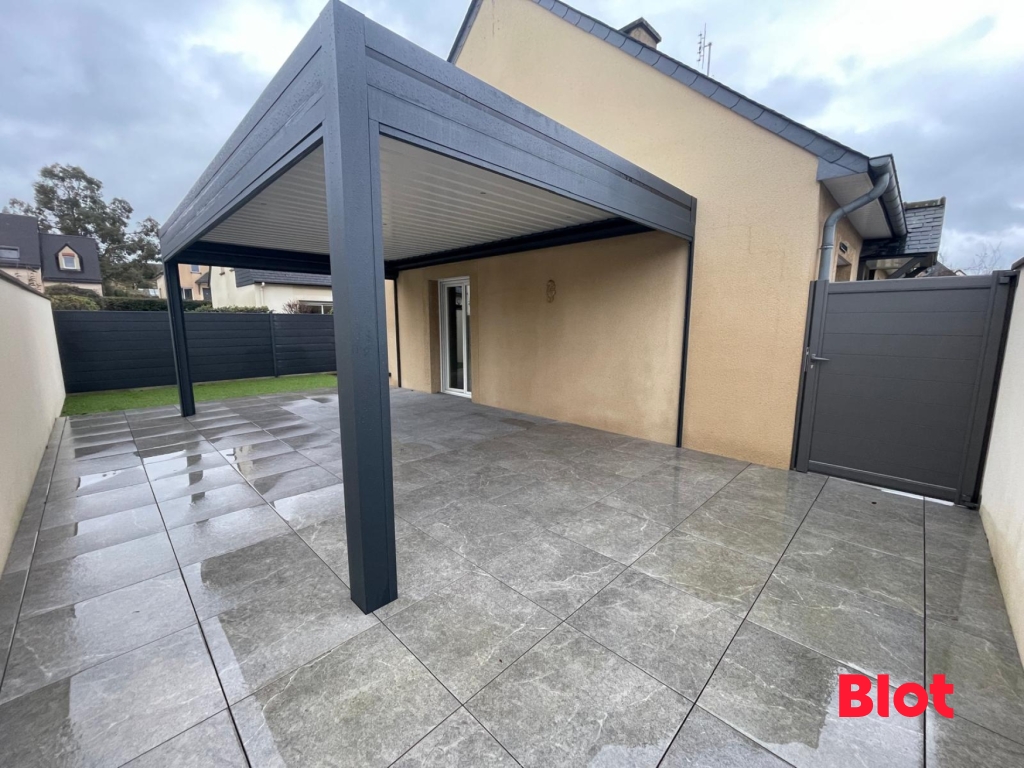 Grande terrasse avec pergola bioclimatique, terrain de pétanque, domotique et panneaux solaires.