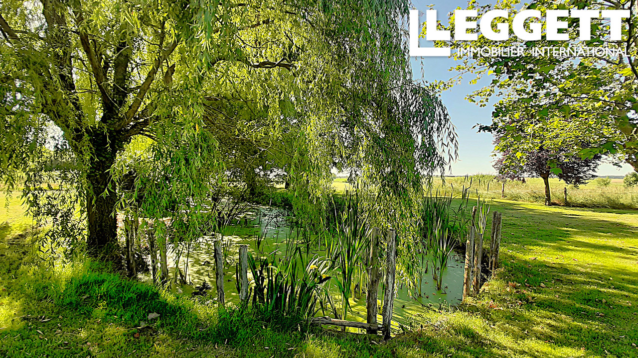 Jardin avec étang et terrain avec petit abri pour animaux.