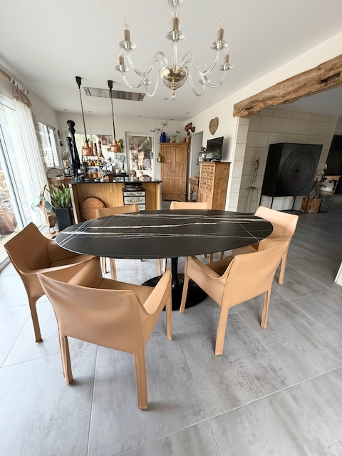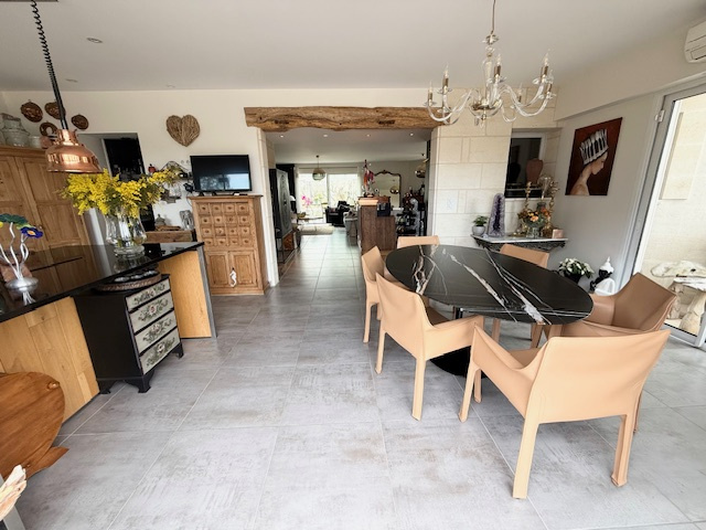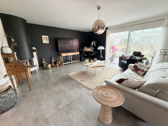 Elle comprend de plain pied 3 chambres ( 10, 11 et 12m2 ), cuisine meublée et équipée avec clim réversible, salon / séjour avec insert de 45 m2, bureau ou dressing, SDB avec douche italienne, WC, deux celliers, véranda et préau avec four à pain, barbecue et plancha.