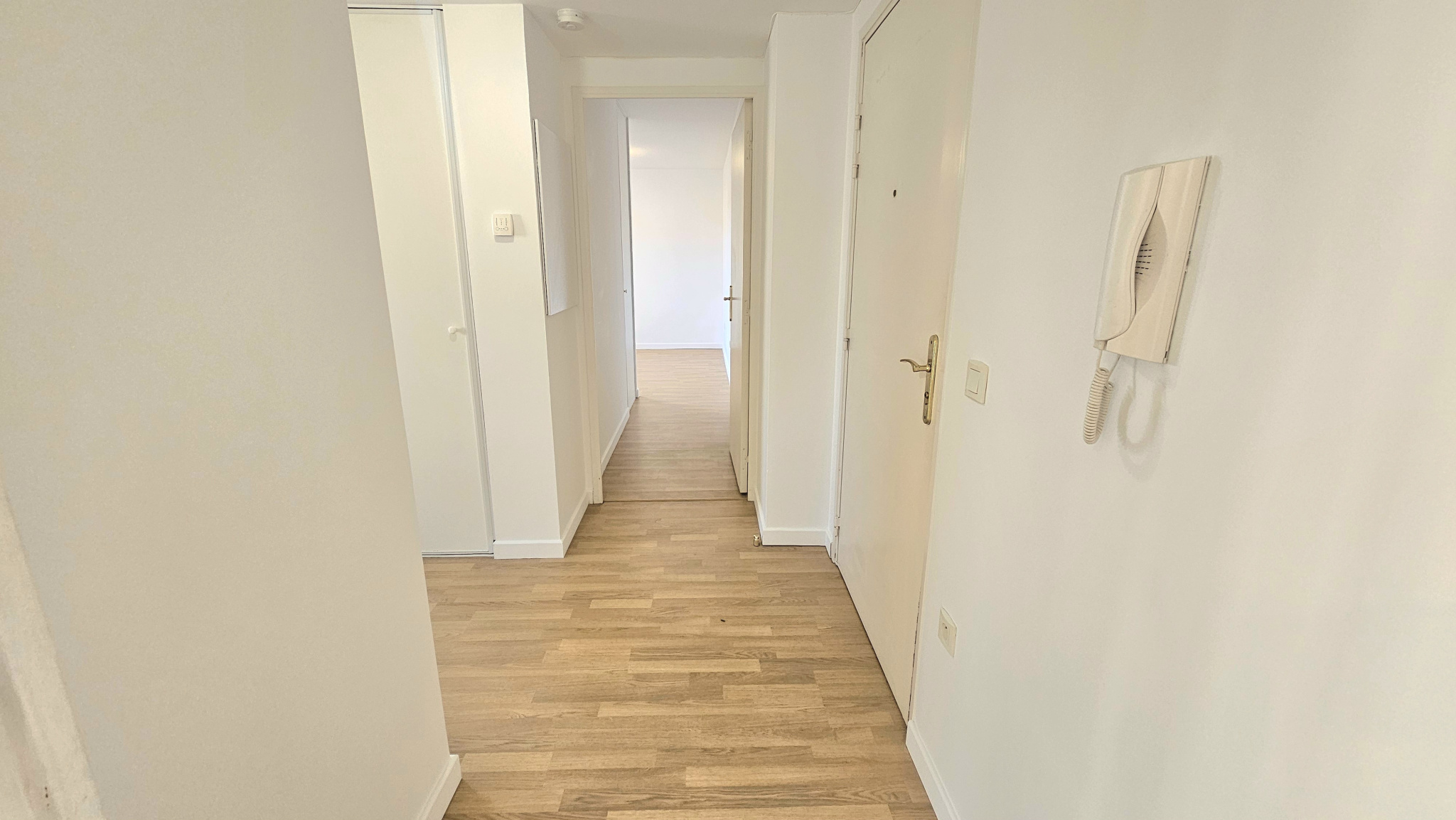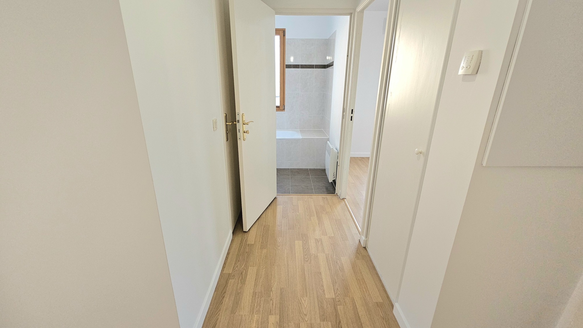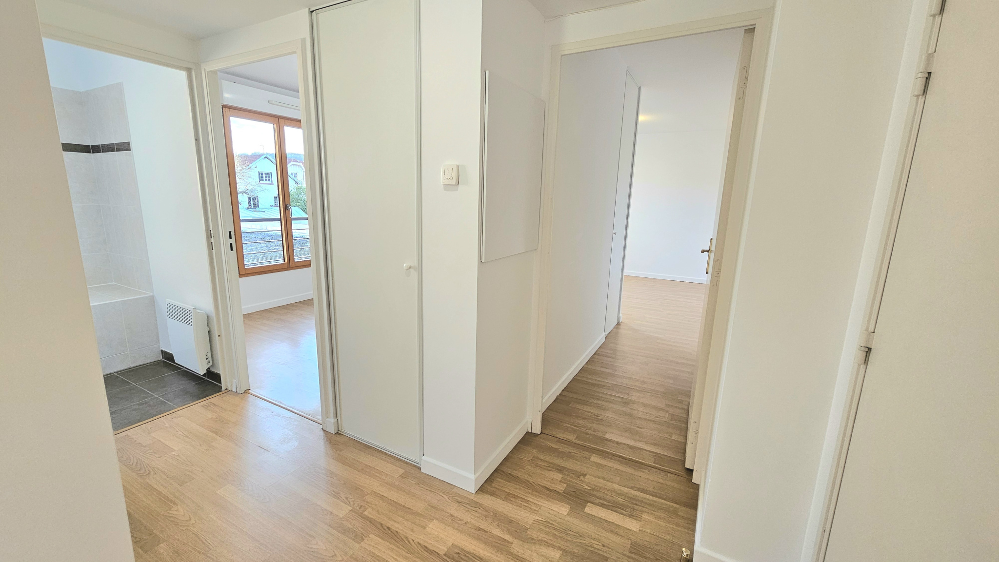 Entrée / dégagement avec placard, cuisine - salle à manger, séjour, deux chambres avec placards, salle de bains, WC séparés. Huisseries double vitrage.