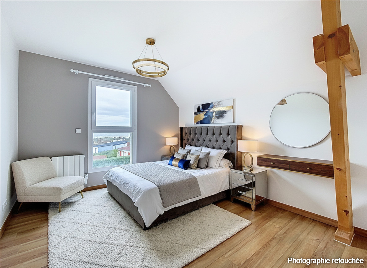L'étage accueille trois chambres confortables ainsi qu'une salle de bains élégante, dotée d'une douche à l'italienne et d'une baignoire d'angle, véritables invitations à la détente. La maison dispose de deux WC, l'un au rez-de-chaussée et l'autre à l'étage, pour plus de praticité.