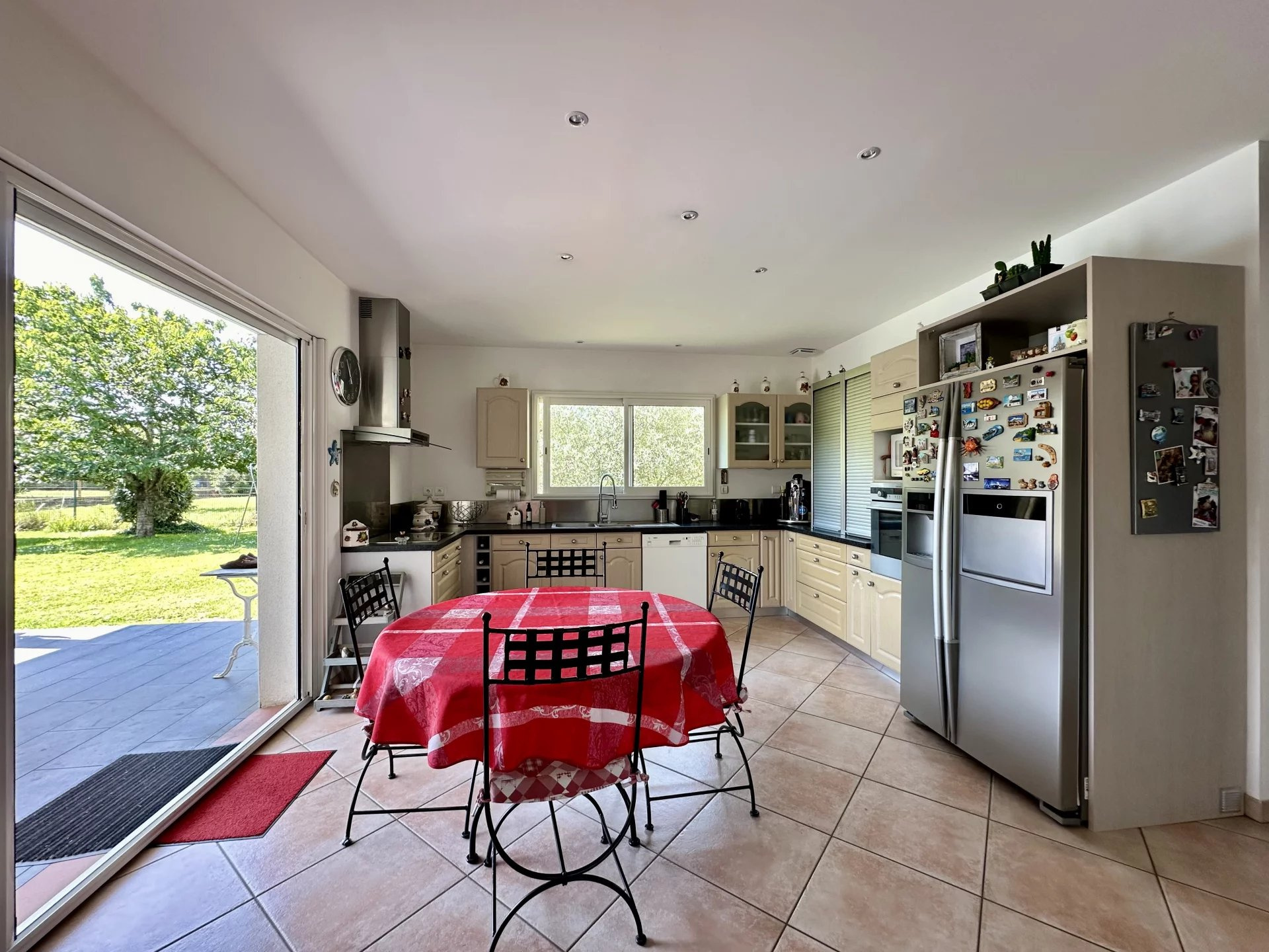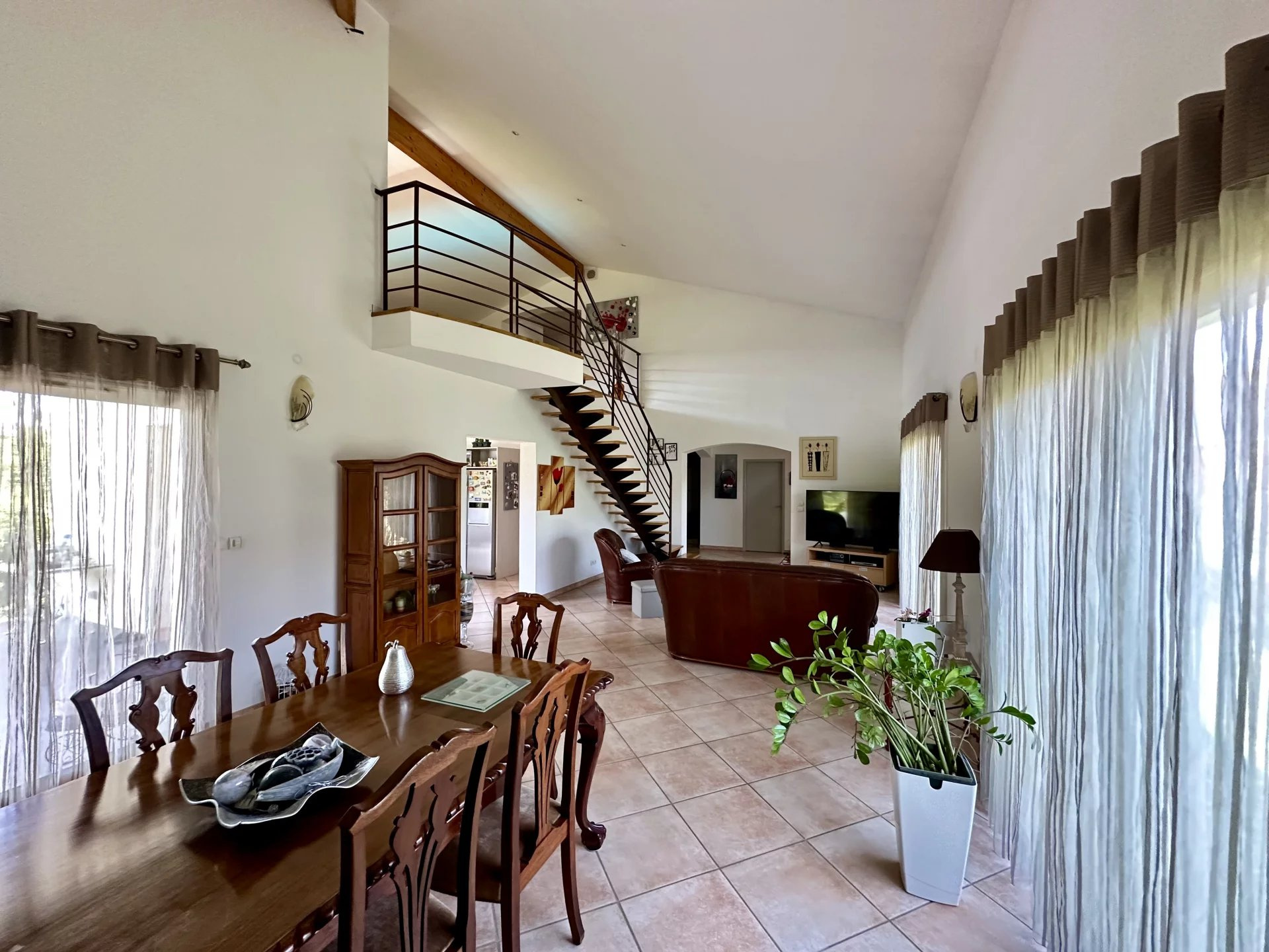 L'entrée s'ouvre sur un séjour lumineux avec plafond cathédrale menant à la cuisine dînatoire de 20m2, son cellier attenant et donnant accès à une belle terrasse couverte à l'abri des regards.