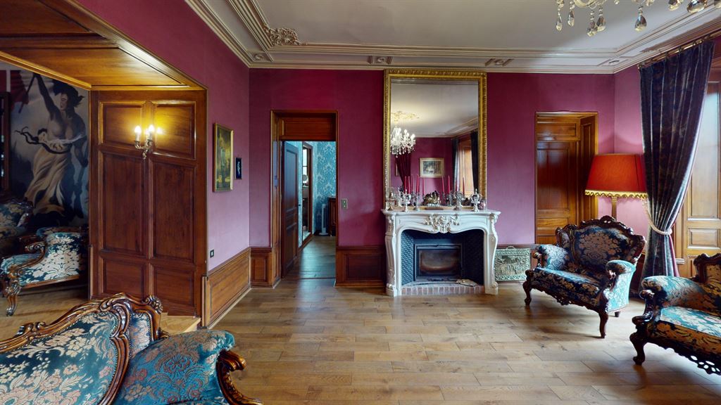 A partir de là, le rez-de-chaussée comporte entrée, bureau avec wc et douche, remise-cave, cuisine, salle à manger, salon double, bibliothèque. Sur le même niveau, les tours abritent le bar au décor néo-gothique pour l’une, et la chaufferie pour l’autre. D’une grande hauteur sous plafond, ces deux pièces occupent deux niveaux.