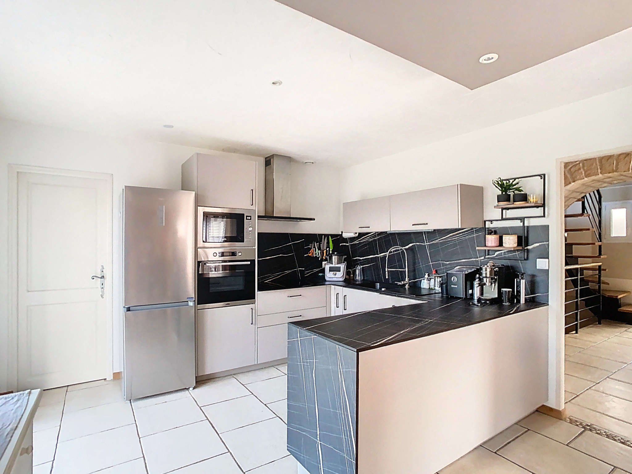 Rez de chaussée comprenant entrée avec placard, spacieuse pièce à vivre traversante de 45 m2, cuisine américaine équipée avec accès terrasse, 2 chambres, salle de bains et WC indépendant.