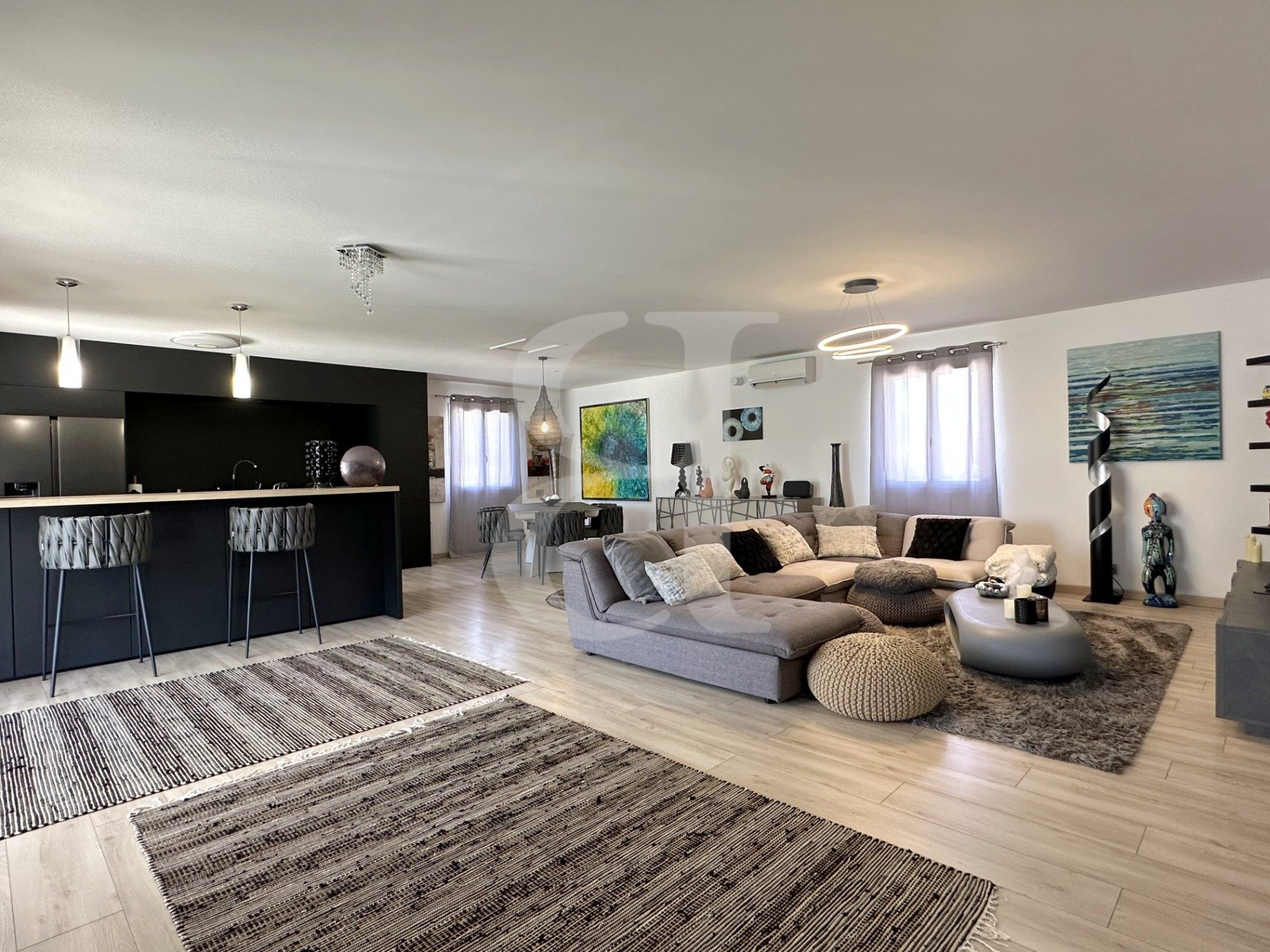 Dès l'entrée, les grandes baies vitrées inondent de lumière un vaste séjour ouvert sur la salle à manger et la cuisine équipée design, créant un espace de vie convivial et élégant.
