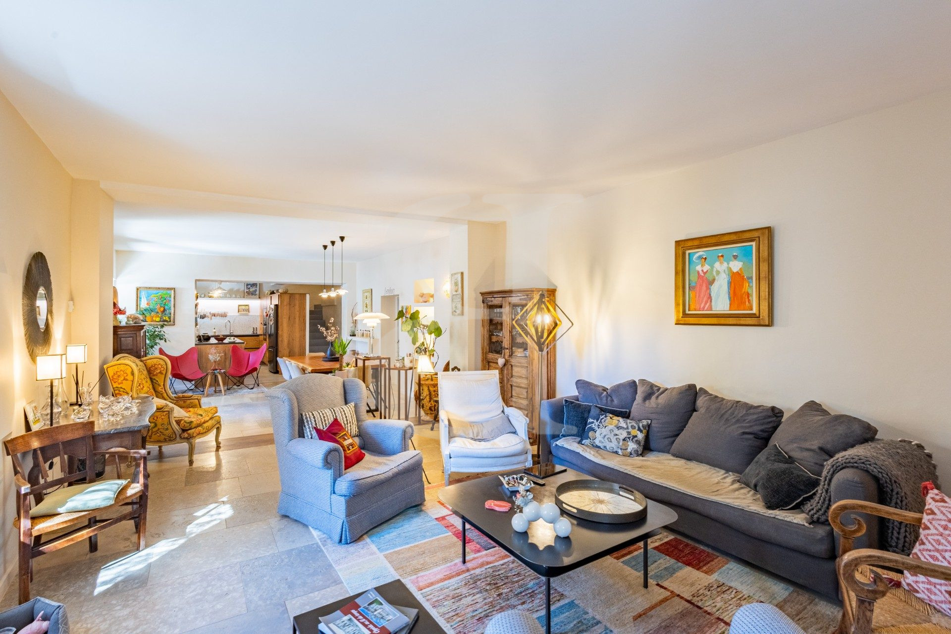Séjour ouvert sur la salle à manger et la cuisine équipée 55 m²