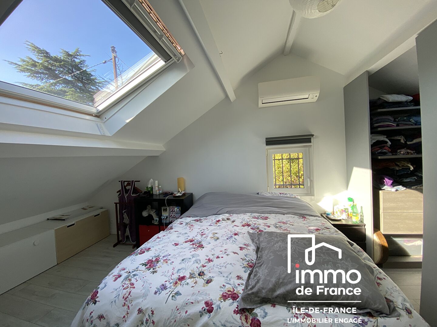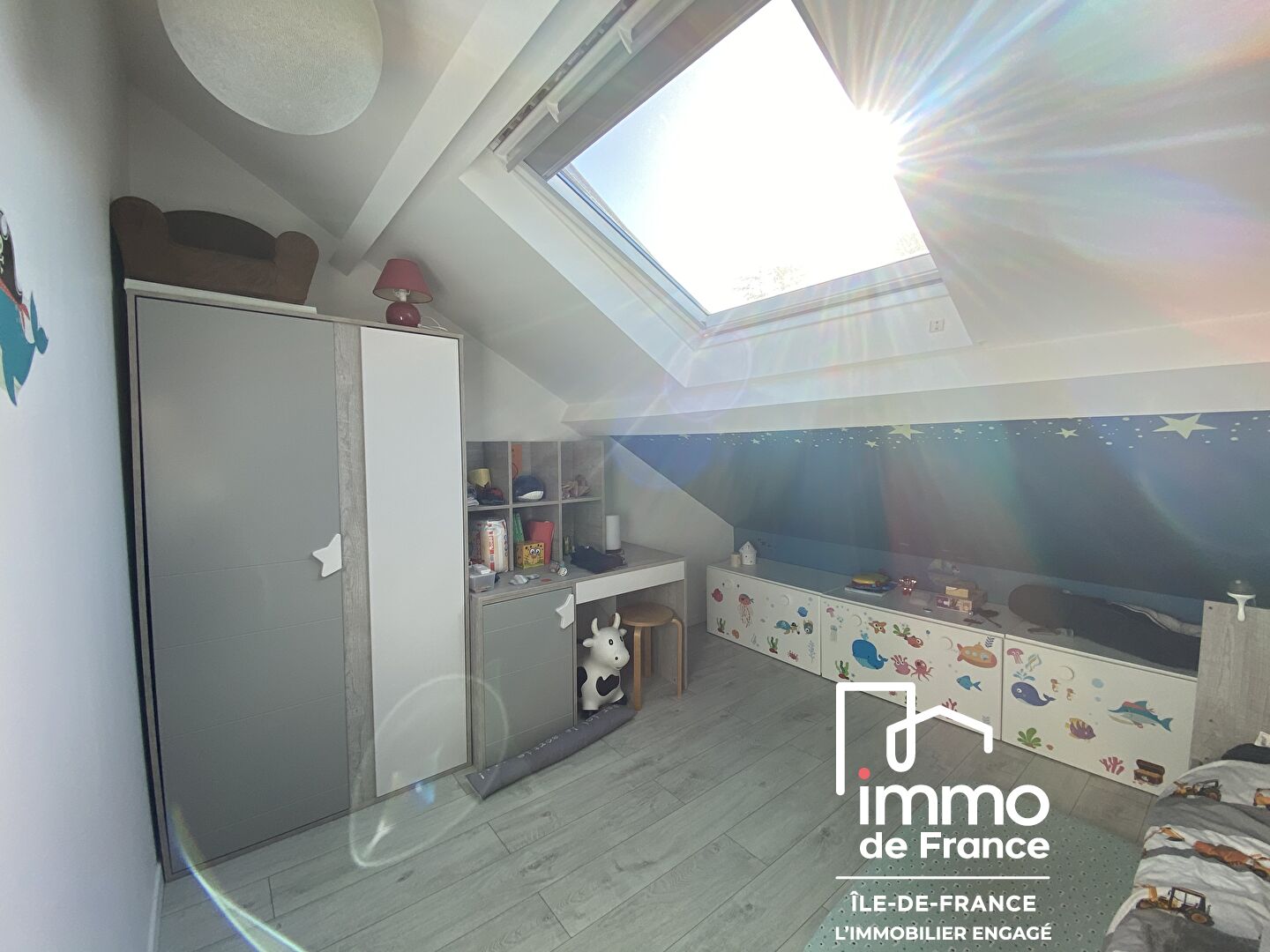 Puis à l'étage, une chambre d'enfant environ 12 m² au sol puis la chambre parentale avec son dressing intégré, une salle de bain avec baignoire et wc.