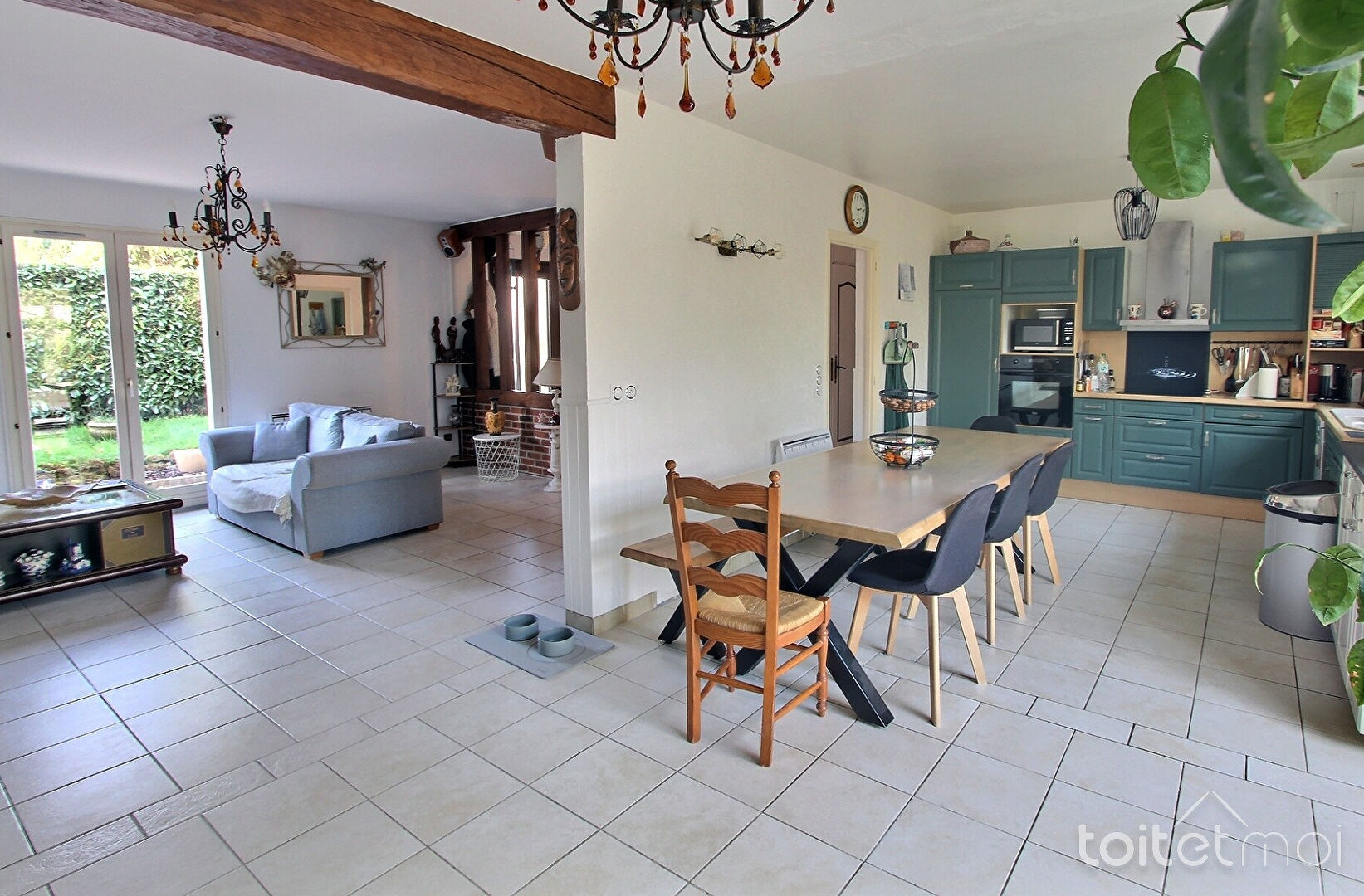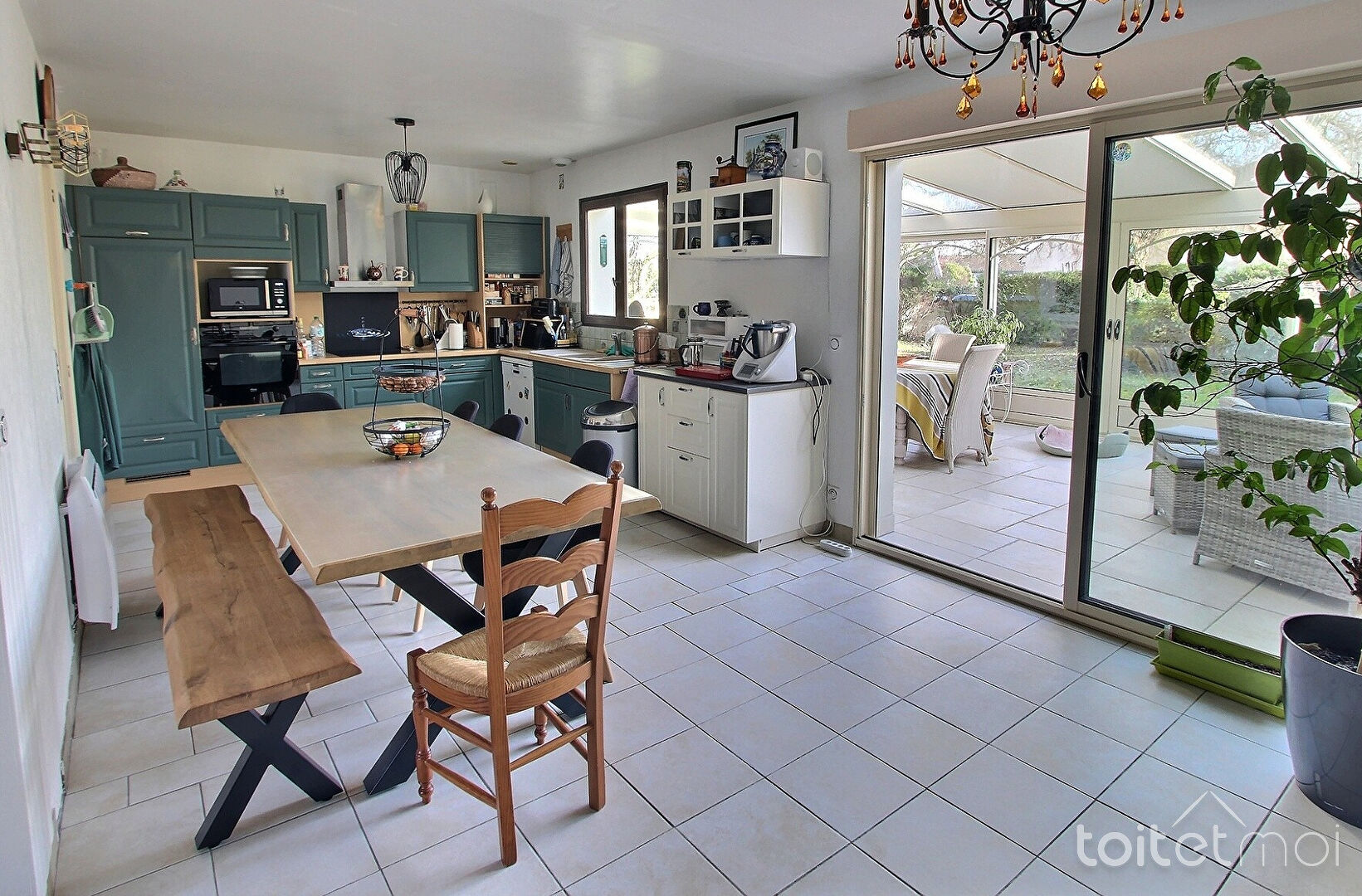Elle comprend au rez-de-chaussée un vaste espace de vie composé d'un séjour/salle à manger avec cheminée à insert, d'une cuisine américaine entièrement équipée, et d'une magnifique véranda largement ouverte sur le jardin.