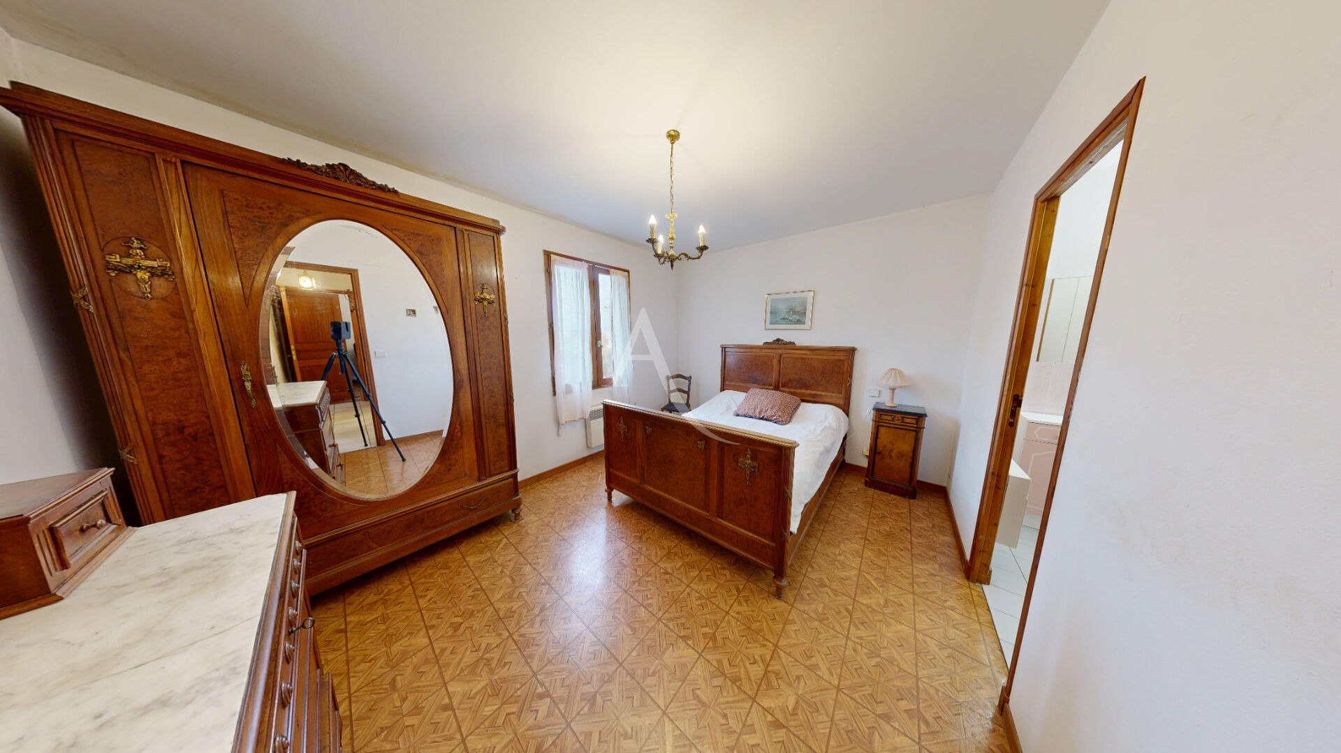 En demi niveau, la maison propose deux chambres, dont une suite parentale avec salle d'eau, ainsi qu'un premier WC.