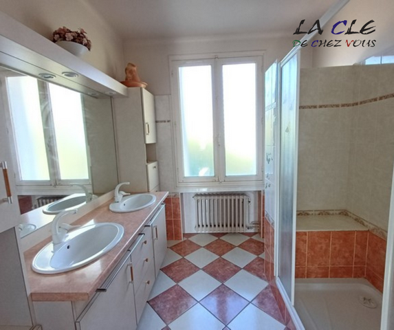 A l'étage, un dégagement avec placards, 4 chambres, 2 salles d'eau et des toilettes.