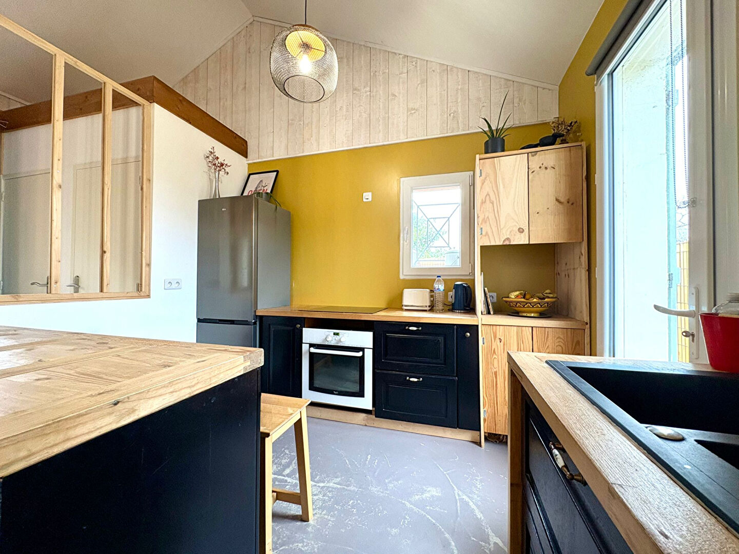 La maison propose une entrée accueillante ouvrant sur une cuisine fonctionnelle, prolongée par un salon-séjour lumineux. La belle hauteur sous plafond, soulignée par des poutres apparentes, apporte chaleur et identité à la pièce de vie.
